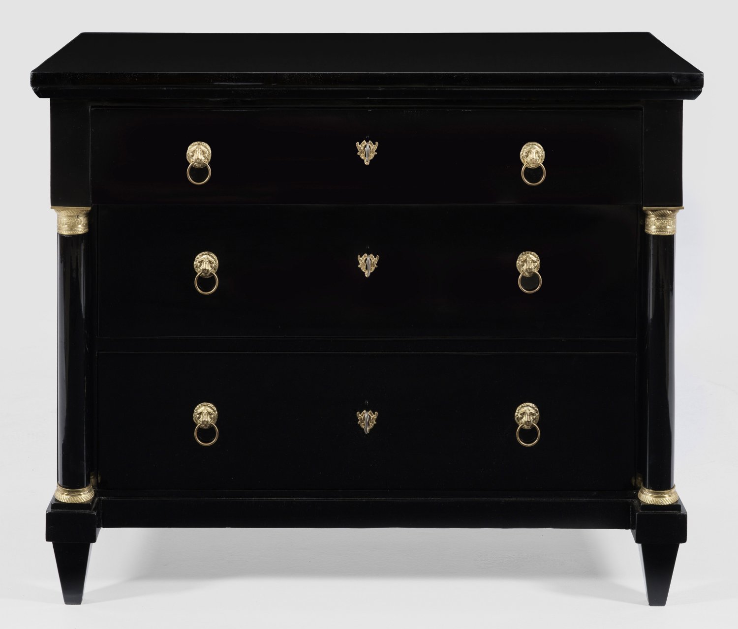 Holz mit flächendeckendem erg. Fond aus Schwarzlack. Gerader, querrechteckig angelegter Korpus, flankiert von eingestellten Säulen auf schmaler Zarge und konischen Vierkantfüßen. In der gegliederten Front drei teilw. vorkragende Schubladen unterschiedlicher Größe. Gering überstehende Deckplatte. H. 85 cm. 104 cm x 56,5 cm.