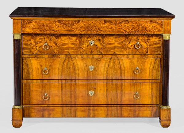 Nussbaum, furniert und teilw. ebonisiert. Gerader querrechteckig angelegter Korpus auf breiter Zarge und gekanteten Füßen. In der gegliederten Front vier, teilw. vorkragende Schubladen, flankiert von eingestellten Vollsäulen. Gering überstehende Deckplatte. H. 87,5 cm. 126 cm x 67,5 cm.