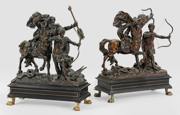 Bronze, dunkel patiniert; ebonisierte Holzsockel mit Messing-Einlagen und vergoldeten Bronze-Tatzenfüßen. Vollplastische, fein gearbeitete, detailreiche, mythologische Gruppen als französische Güsse des 19. Jhs.; François Rude gehört zu den bedeutendsten französischen Bildhauern in der 1. Hälfte des 19. Jhs.; zu den vorliegenden Bronzen wurde er durch das monumentale, 1783 vollendete Gemälde "L'Éducation d'Achille par le centaure Chiron" von Jean-Baptiste Régnault (1754-1829) inspiriert, das sich heute im Louvre befindet. 1809 ging Rude nach Paris und studierte an der École des Beaux-Arts bei Pierre Cartellier; 1812 erhielt er den Prix de Rome, konnte ihn aufgrund der historischen Umstände nie in Anspruch nehmen. 1815 zog er zu seiner Schwiegerfamilie nach Brüssel, wo er mit dem Architekten Charles van der Straeten zusammenarbeitete. Er führte neun Basreliefs für einen der Pavillons des Palastes von Tervuren aus, außerdem offizielle Aufträge König Wilhelm I. an königlichen Palästen, Schlössern, Denkmälern und Bauten in Brüssel. 1827 kehrte Rude nach Paris zurück, 1833 wurde er in die Ehrenlegion aufgenommen und schuf ein Hochrelief für den Arc de Triomphe de l’Étoile - "La Marseillaise", sein berühmtestes Werk, das wesentlich zu seinem Ruhm beitrug. Rude erhielt danach bedeutende Aufträge für öffentliche Denkmäler. 1855 wurde Rude auf der Weltausstellung in Paris mit einer Ehrenmedaille ausgezeichnet. 35 cm x 30 cm x 13,5 cm.