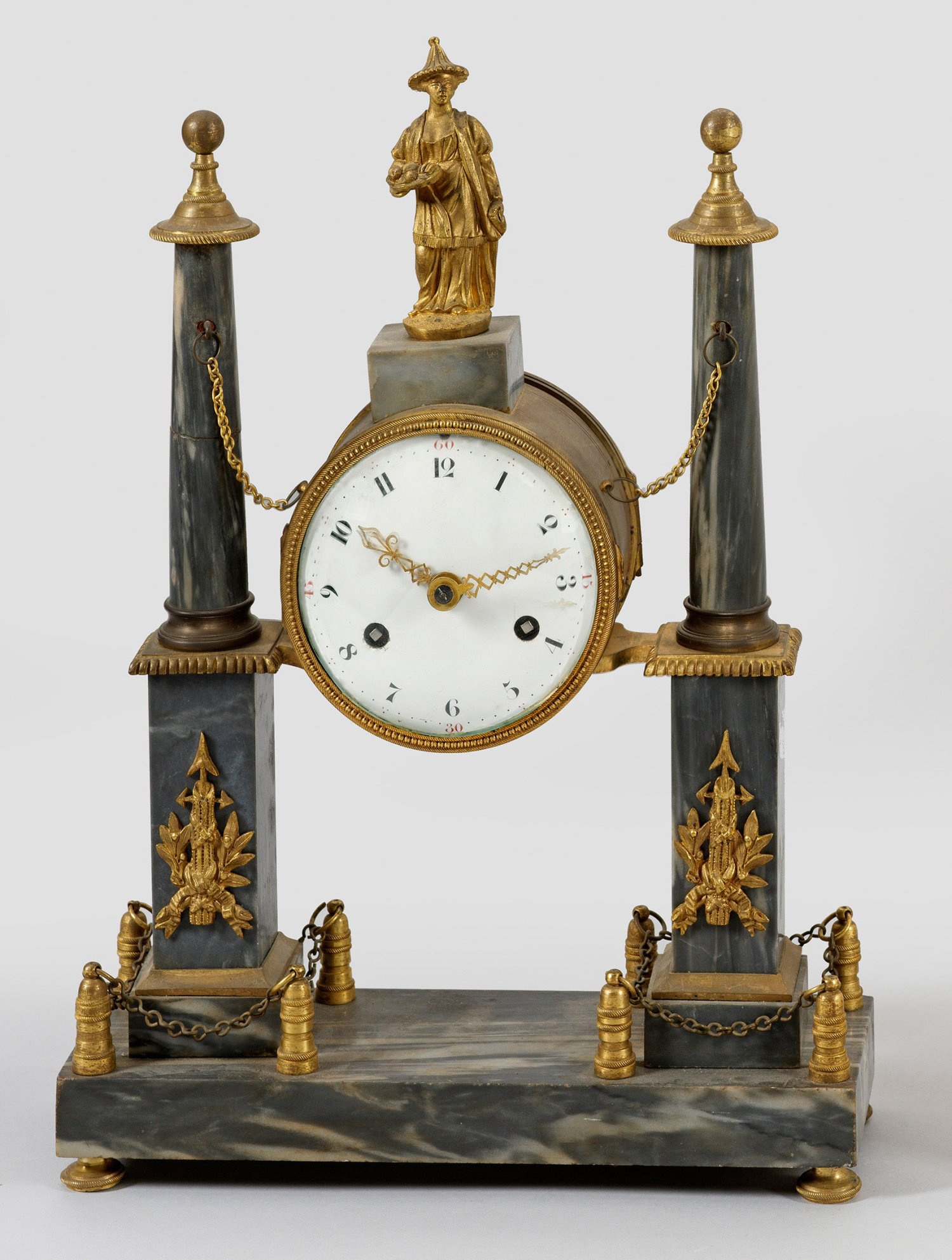 Grau gemaserter Marmor und Bronze. Über rechteckiger Basis auf gedrückten Füßen gekantete Sockel mit Säulenabschlüssen als Träger für rundes Uhrengehäuse mit Bekrönung in Gestalt einer Chinesin. Verglastes Zifferblatt. Pendulenwerk mit Fadenaufhängung sowie Halbstundenschlag auf Glocke. Pendel fehlt. H. 36 cm. 25,5 cm x 8 cm.
