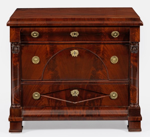 Mahagoni, furniert. Gerader, querrechteckig angelegter Korpus, flankiert von eingestellten Halbsäulen auf schmaler Zarge und gekanteten Füßen. In der gegliederten Front drei breite, teilw. bombierte Schubladen unterschiedlicher Größe. Gering überstehende, gestuft ansteigende Deckplatte. H. 83,5 cm. 97 cm x 55 cm.
