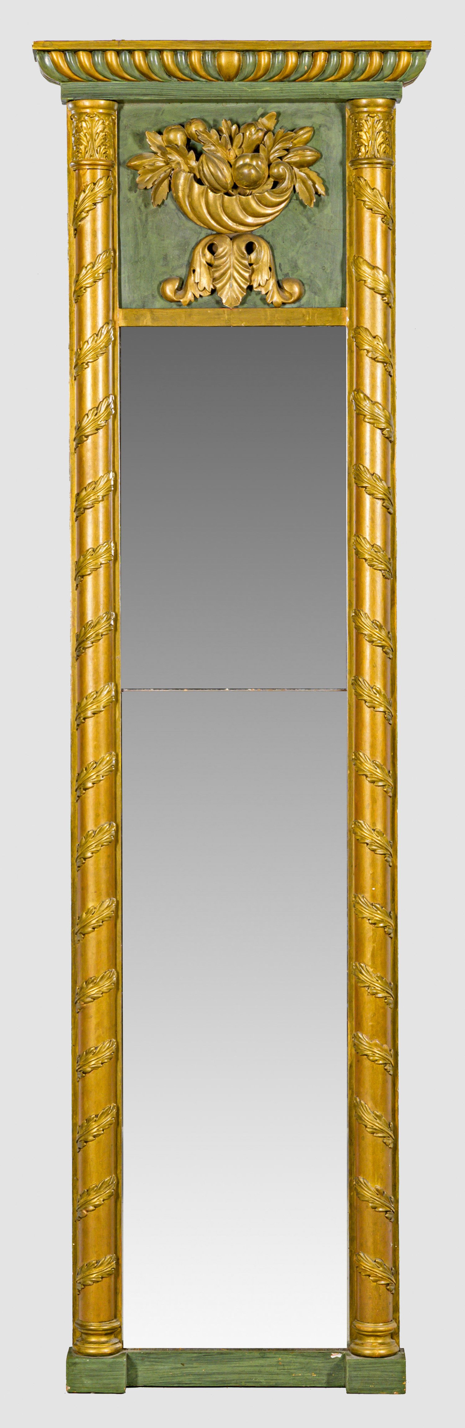 Holz, geschnitzt, grün gefasst und teilw. vergoldet. Gestreckte Spiegelrahmung, flankiert von eingestellten Halbsäulen mit reliefplastischem Blattdekor. Im Giebelfeld plastische Darstellung von Früchten. Oberhalb flaches Gesims. Zweigeteiltes, facettiertes Spiegelglas. 209 cm x 62 cm.