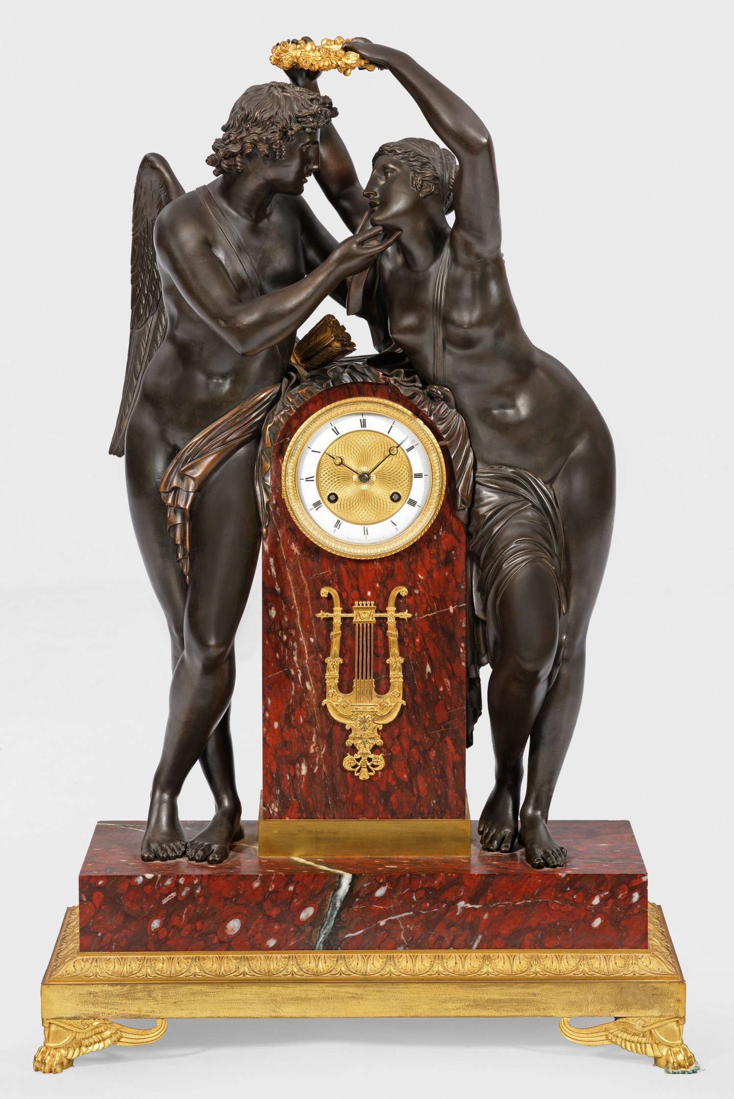 Bronze, dunkel patiniert und teilw. vergoldet sowie bordeauxroter, grau-weiß gemaserter Marmor. Vollplastische Darstellung von Amor und Psyche mit Rosenkranz, an das hochrechteckige Uhrengehäuse mit appliziertem Puttenpaar gelehnt. Verglastes guillochiertes Zifferblatt mit Emailziffernring, bez. Galle Rue Vivienne No 9. Unterhalb breiter, gestuft ansteigender Sockel mit Palmettenfries auf Tatzenfüßen. Pendulenwerk mit Fadenaufhängung sowie Halbstundenschlag auf Glocke. H. 84 cm. 54 cm x 23 cm.