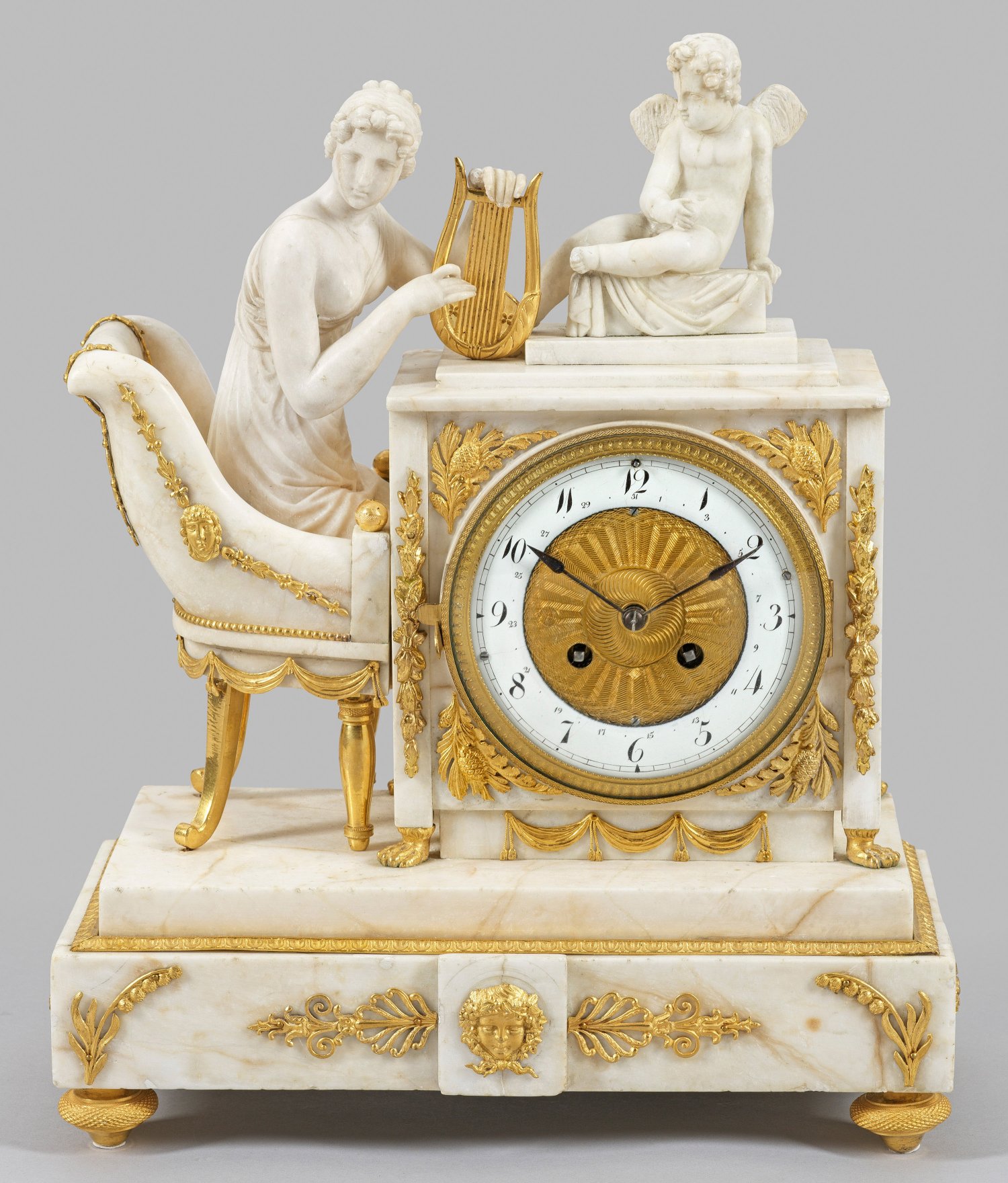 Cremefarben gemaserter Marmor und vergoldeten Bronzeapplikationen. Querrechteckig angelegter Sockel auf gedrückten Balusterfüßen. Oberhalb rechteckiges Uhrengehäuse mit Amorettenbekrönnug sowie vollplastisch gestaltete Lyraspielerin in einem Gondelsessel. Verglastes teilw. guillochiertes Zifferblatt mit Emailziffernring. Erg. französisches Pendulenwerk mit Pendelfeder sowie Schlagwerk auf Glocke. Rest. H. 38 cm. 31 cm x 14 cm.