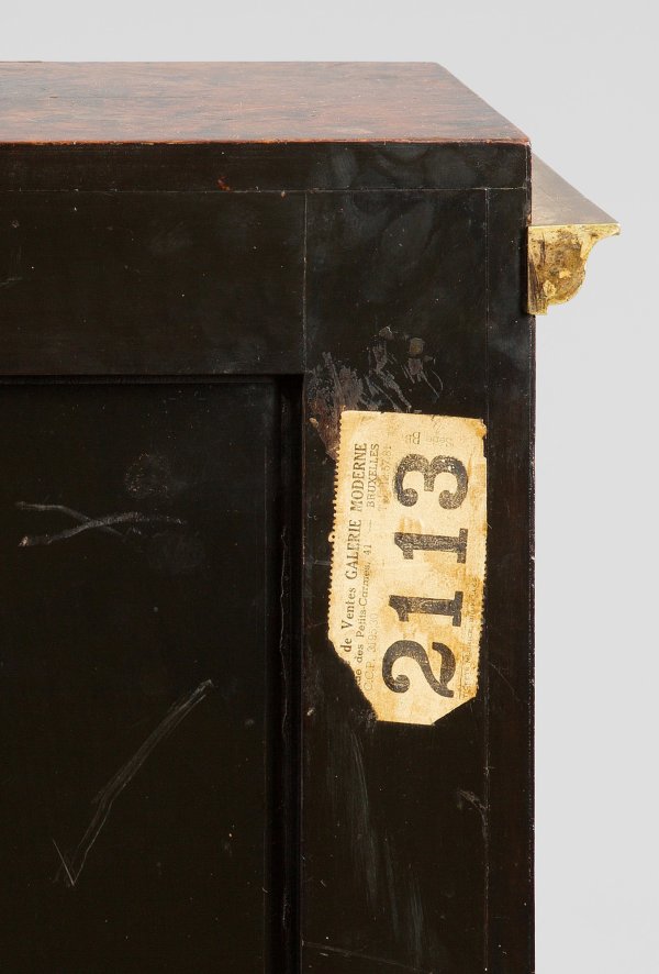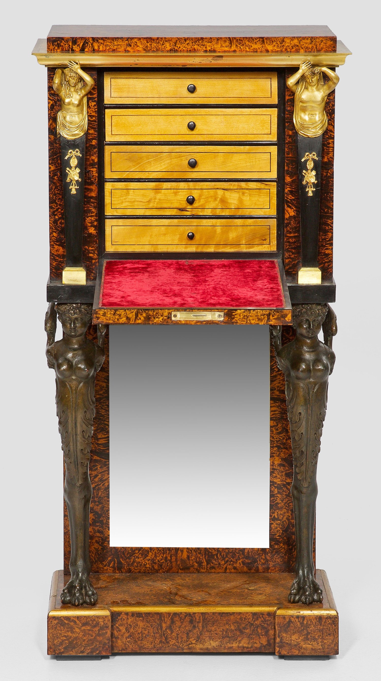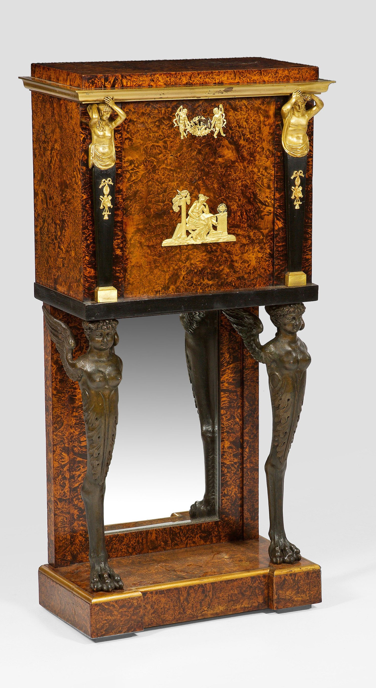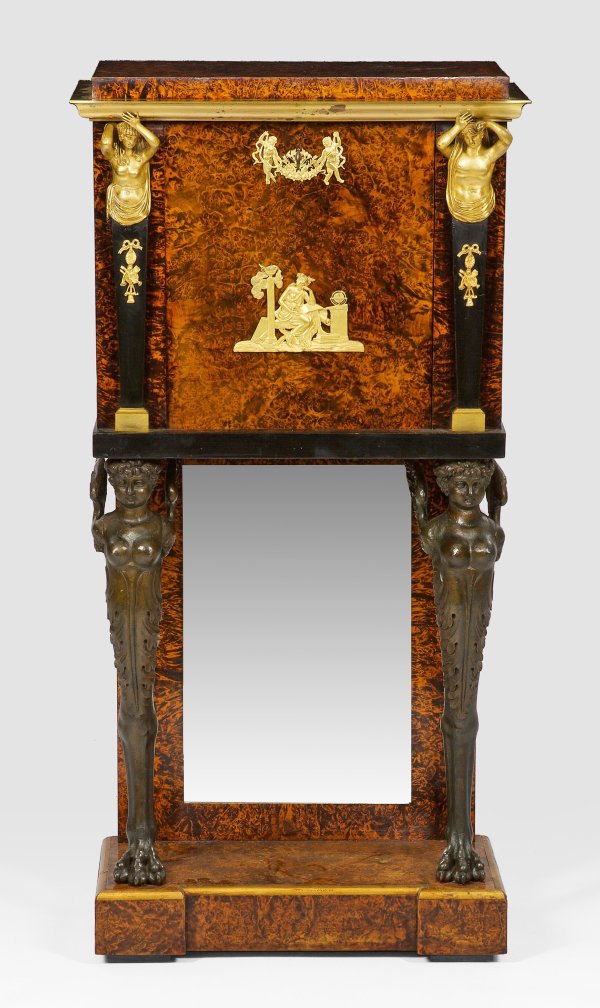 Wurzelnuss, furniert, kontrastierend gebeizt und teilw. ebonisiert sowie Holz geschnitzt und dunkel gefasst. Applikationen aus feuervergoldeter Bronze. Über gekantetem Sockel vollplastisch gestaltete Genien und verspiegelte Rückwand als Träger für hochrechteckigen Korpus. In der Front abklappbare Arbeitsfläche mit bordeauxrotem Samtbezug, flankiert von eingestellten, unterschiedlich gestalteten Karyatiden als Stützen für Profilgesims. Dahinter fünf, teilw. erg. Schubfächer. Rückseitig Etikett "Galerie Moderne, Bruxelles". Undeutlich mit Bleistift bez. "Hutz(?) 1850". H. 112 cm. 55,5 cm x 28 cm.