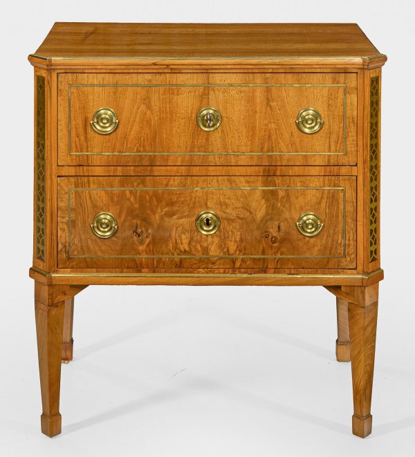 Helles Nussbaum, furniert sowie Einlagen aus Messing. Gerader, rechteckiger Korpus, flankiert von schmalen, schräggestellten Ecklisenen, auf hohen, konischen Beinen. In der gegliederten Front zwei Schubladen. Gering überstehende, profilgerahmte Deckplatte. H. 82,5 cm. 76,5 cm x 45 cm.