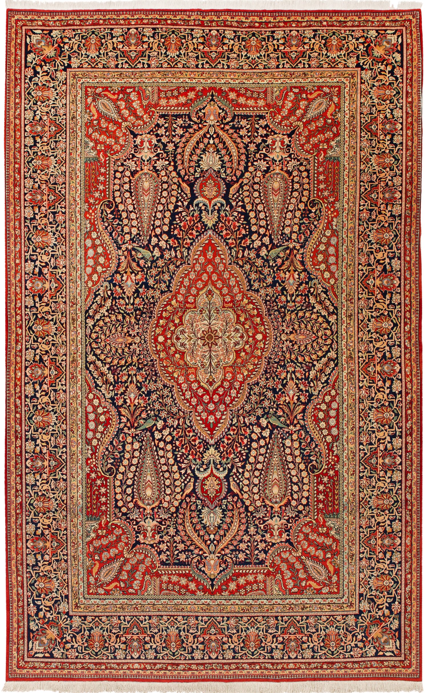 Persien. Wolle auf Baumwolle. Auf dunklem Fond gestrecktes, rotes Zentralmedaillon sowie entsprechende, passig geschweifte Ecklösungen. Flächendeckende Musterung aus dicht angeordneten Blütenrispen und Zypressen. Umlaufend breite, korrespondierende Bordüre, begrenzt von schmalen Bändern. 335 cm x 215 cm.