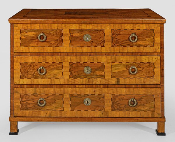 Nussbaum und Nussbaummaser, furniert sowie Einlagen aus unterschiedlichen Hölzern. Gerader, querrechteckig angelegter Korpus auf schmaler Zarge und gekanteten Füßen. In der gegliederten Front drei breite Schubladen. Gering überstehende Deckplatte. Flächendeckend breit gerahmte Furnierfelder, von ornamentierten Bandeinlagen begrenzt. H. 84 cm. 111 cm x 58 cm.