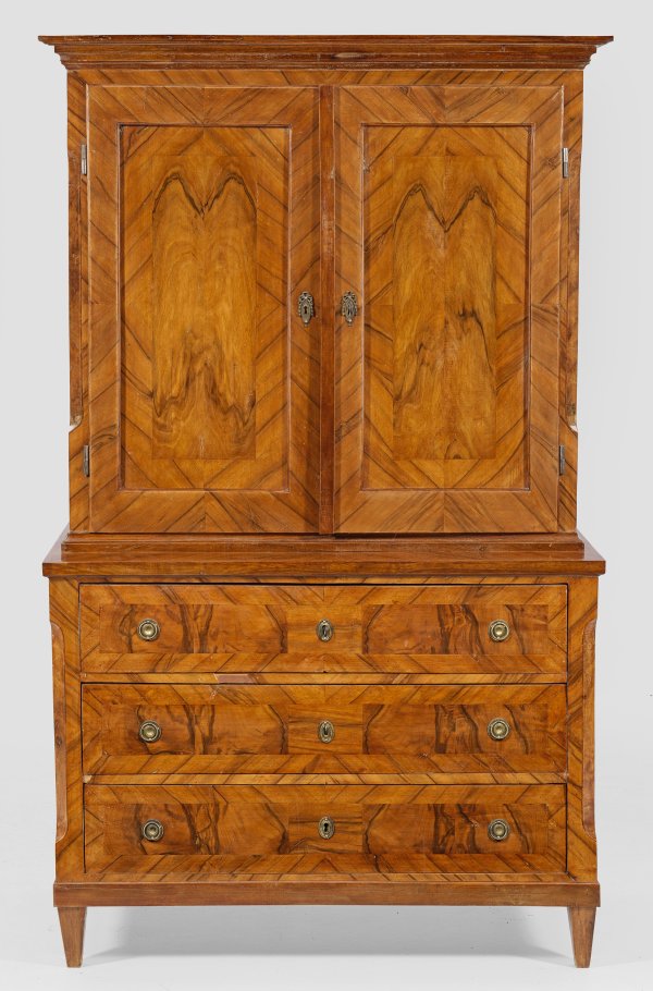 Nussbaum, furniert. Gerader, querrechteckig angelegter Korpus mit angeschrägten Ecken auf schmaler Zarge und konischen Vierkantbeinen. In der gegliederten Front drei breite Schubladen. Oberhalb korrespondierender, zweitüriger Aufsatz mit Profilgesims. Erg.; H. 190 cm. 115 cm x 57 cm.