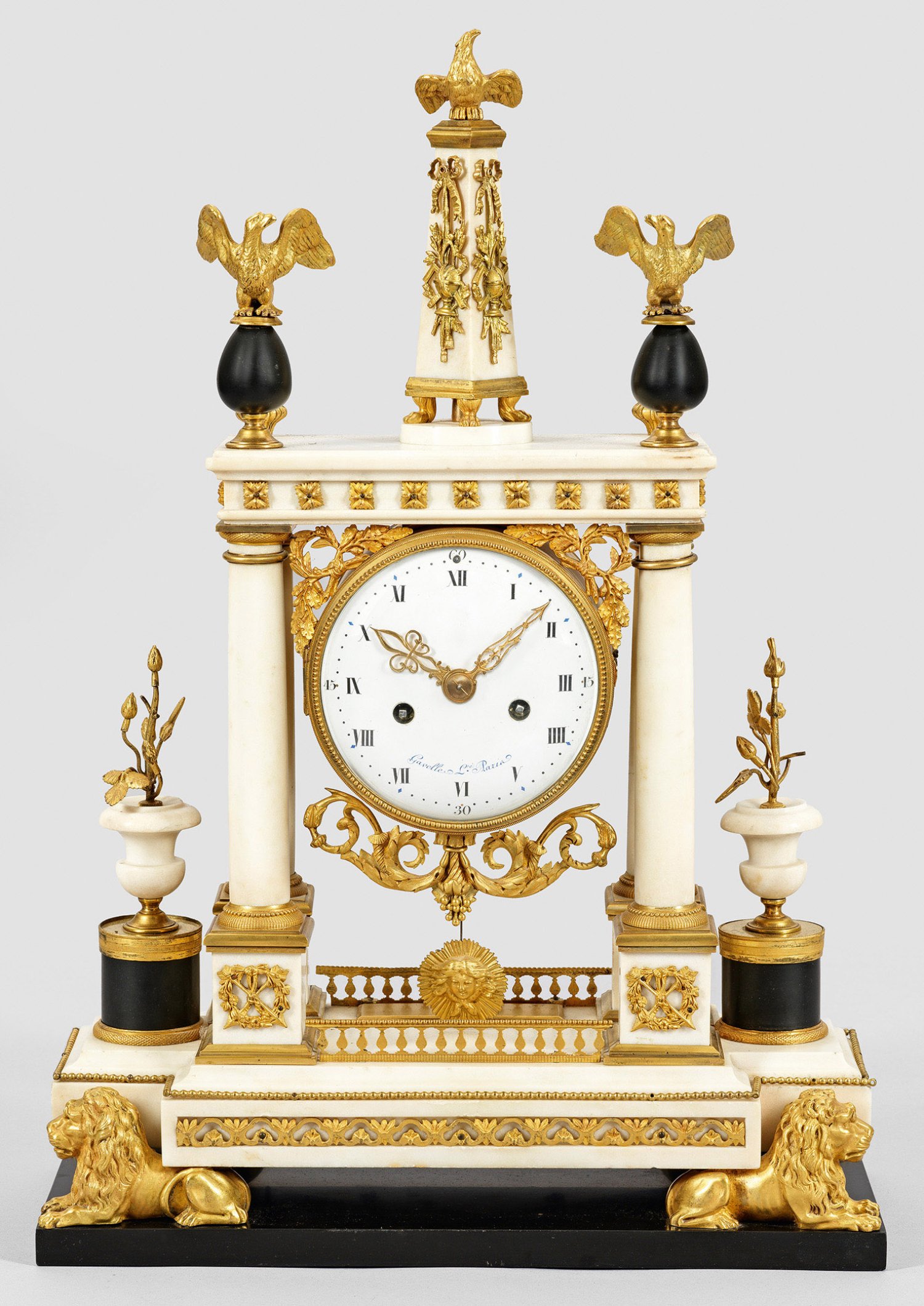 Weißer und schwarzer Marmor sowie Bronze, feuervergoldet und fein ziseliert. Über querrechteckig angelegtem, gestuft ansteigendem Sockel mit vollplastischen Löwen architektonisch gegliederter Korpus aus Vollsäulen, flankiert von blütengefüllten Kratervasen. Bekrönung in Form eines Obelisken. Verglastes Emaillezifferblatt, bez. Gavelle L'e Paris. Pendulenwerk mit Fadenaufhängung sowie Halbstundenschlag auf Glocke. H. 60 cm. 41 cm x 18 cm.