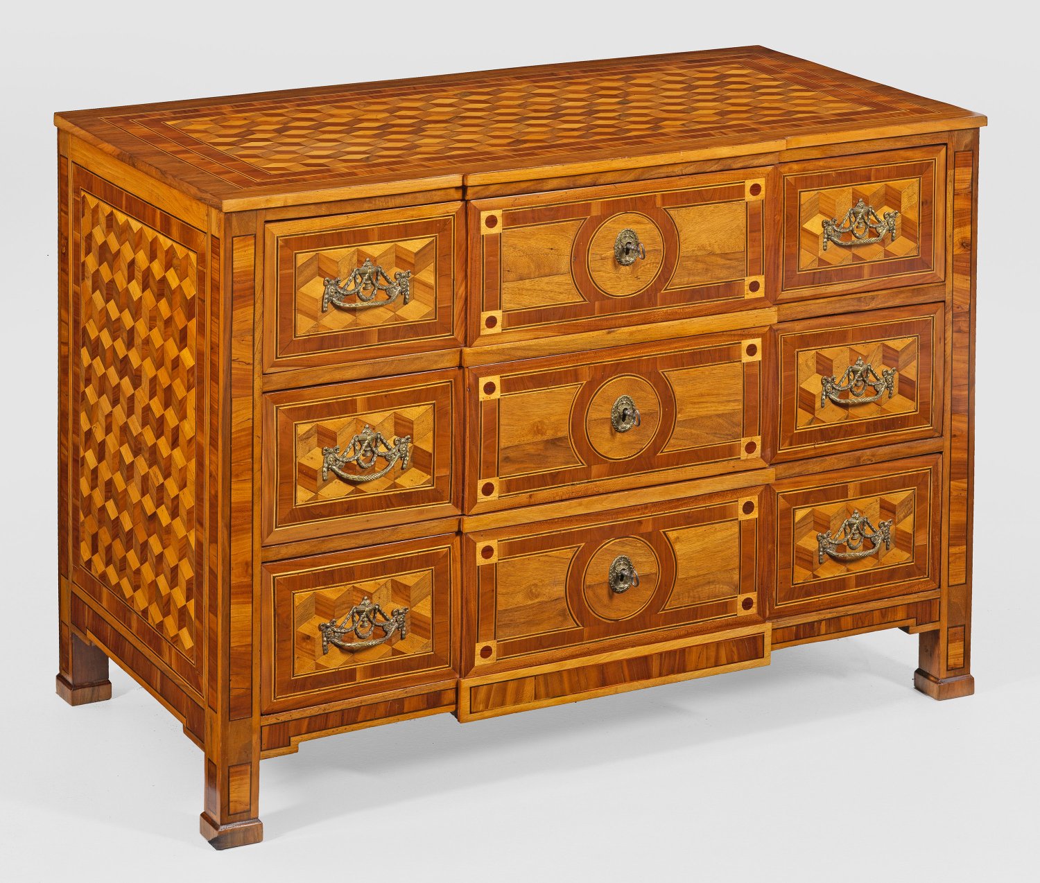 Nussbaum, Pflaumenholz und Ahorn, furniert. Gerader, querrechteckiger Korpus auf gekanteten Füßen. In der gegliederten Front drei breite Schubladen, durch flachen Mittelrisalit verbunden. Gering überstehende Deckplatte. Flächendeckend breit gerahmte Furnierfelder aus Würfelmarketerie, von schmalen Bandeinlagen begrenzt. H. 86,5 cm. 118 cm x 63,5 cm.