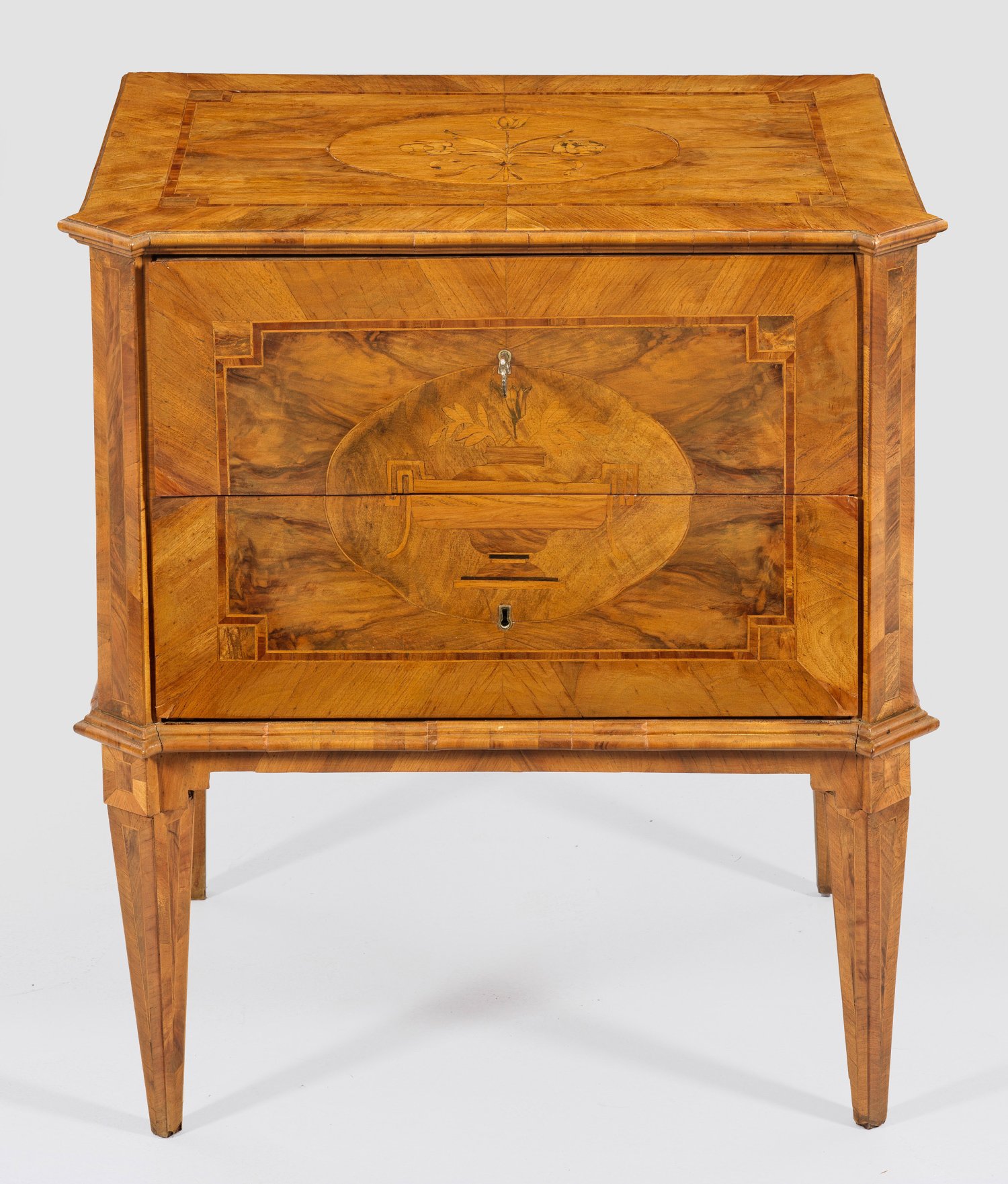 Nussbaum, furniert sowie Einlagen aus unterschiedlichen Hölzern. Gerader, rechteckig angelegter Korpus, flankiert von schräggestellten Ecklisenen auf konischen Vierkantbeinen. In der gegliederten Front zwei Schubladen sans traverse, optisch durch Vasenmotiv verbunden. Gering überstehende, profilierte Deckplatte mit verkröpften Ecken. Flächendeckende Furnierfelder, von Bandeinlagen begrenzt. H. 80 cm. 73 cm x 50 cm.
