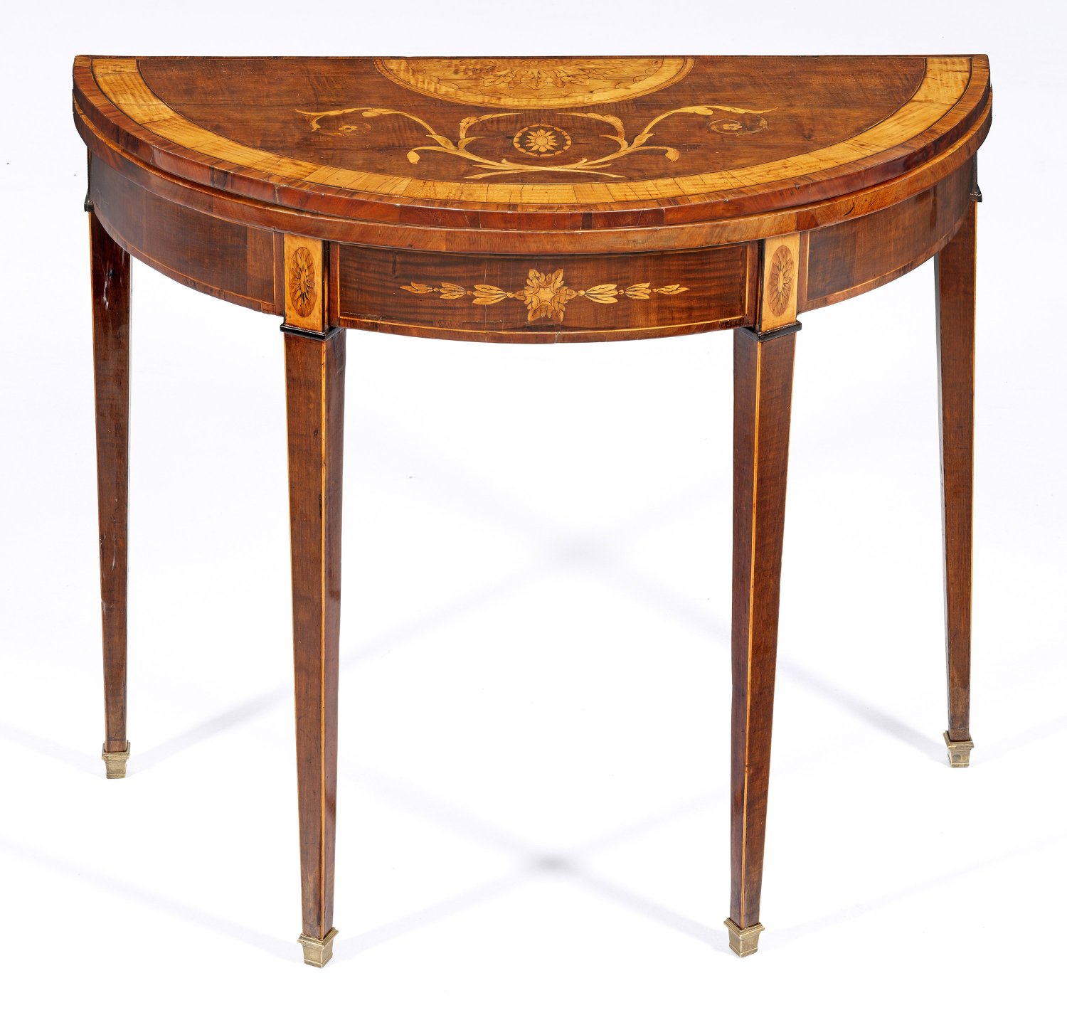 Nussbaum und Ahorn, furniert. Bombierte Zarge auf konischen, rücks. teilw. ausstellbaren Vierkantbeinen als Träger für gering überstehende, aufklappbare Deckplatte. Unterhalb grüne Spielfläche. Flächendeckend breit gerahmte Furnierfelder, von Fadeneinlagen begrenzt. H. 77 cm. 91,5 cm x 44/88 cm.