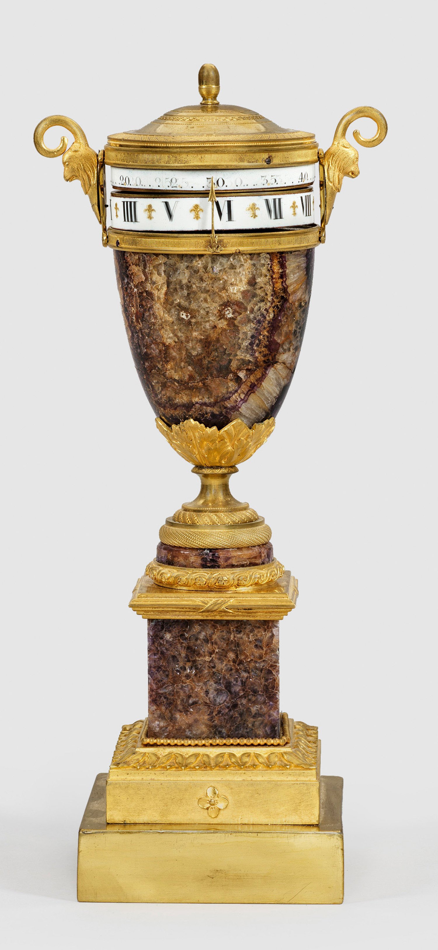 In unterschiedlichen Violett-, Beige- und Gelbtönen, sog. "Blue John" Fluorit und feuervergoldete Bronze. Über gestuft ansteigendem Sockel mit umlaufendem Fries aus Palmetten und Perlstab balusterförmiger, sich konisch weitender Korpus, seitlich mit kleinen Henkeln aus Löwenmaskarons und Voluten. Flach ansteigender Deckel mit Bekrönung in Form einer stilisierten Eichel. In der Vase eingesetzte, drehbare Ziffernringe aus Email mit römischen und arabischen Zahlen, vergoldeten Bourbonen-Lilie und Pfeilanzeiger. Altersbedingte Spannungsrisse. H. 31 cm.