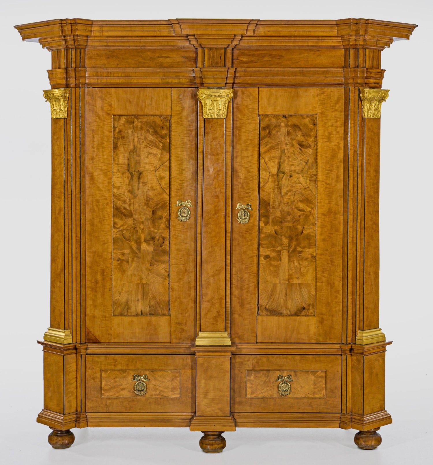 Ahorn und Nussbaum, furniert. Über zweischübigem Zargensockel und gedrückten Füßen rechteckiger Korpus, flankiert von breiten, schräggestellten Ecklisenen mit aufgelegten Pilastern mit vergoldeten Kapitellen. In der gegliederten Front zwei große Türen. Stark vorkragendes, mehrfach profiliertes Kranzgesims. Flächendeckend breit gerahmte Furnierfelder. H. 206 cm. 200 cm x 76 cm.