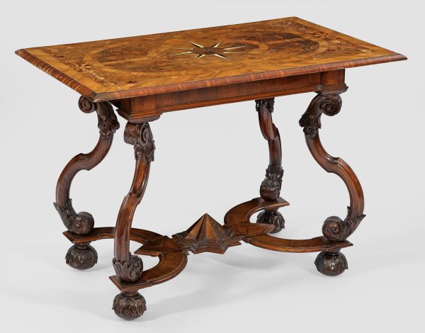 Nussbaum, reliefplastisch geschnitzt bzw. furniert sowie Einlagen aus unterschiedlichen, teilw. gefärbten Edelhölzern und Elfenbein. Gerade, profilierte Zarge auf hohen, stark geschwungenen Beinen aus eingerollten Blattvoluten, unterhalb durch breite, gebogte Stege mit pyramidalem Abschluss verbunden. Korrespondierende Kugelfüße. Weit überstehende, rechteckige Deckplatte mit zentralem Faltstern, umgeben von großen Reserven aus breiten Bandeinlagen. In den Ecken aufwändig intarsierte Blütenmotive, Schnecken und Eidechsen. Erg. und Fehlstellen. H. 82 cm. 114 cm x 71 cm.