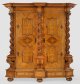 Nussbaum, furniert bzw. teilw. reliefplastisch geschnitzt sowie Einlagen aus Ahorn. Hochrechteckig angelegter Korpus mit schräggestellten Ecklisenen auf stark profiliertem, zweischübigem Zargensockel und gedrückten Füßen. In der gegliederten Front zwei große Türen mit zentral intarsierten Sternmotiven sowie flachen, bastionartigen Füllungen mit flächendeckendem feinen Intarsiendekor aus üppigen Blattranken, flankiert von kräftigen, gedrehten Säulen mit korinthischen Kapitellen für breite Voluten. Korrespondierendes, stark vorkragendes Kranzgesims mit verkröpften Ecken. H. 254 cm. 250 cm x 87 cm.