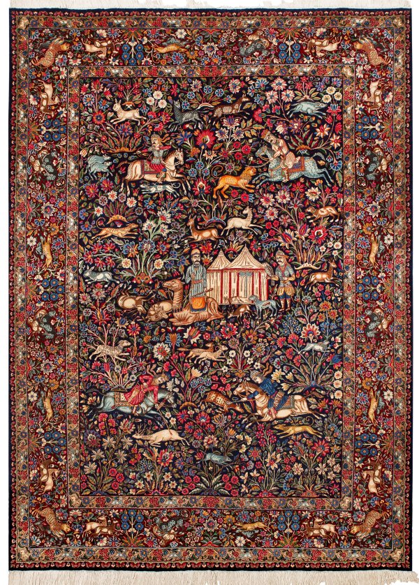 Persien. Um 1930. Korkwolle auf Baumwolle. Auf dunklem Fond flächendeckende Jagdmusterung mit zentraler Jurte sowie berittenen Jägern, unterschiedlichen Wildtieren und dicht angeordneten Blütenzweigen. Umlaufend breite Hauptbordüre mit korrespondierender Musterung, begrenzt von Blütenbändern. 295 cm x 218 cm.