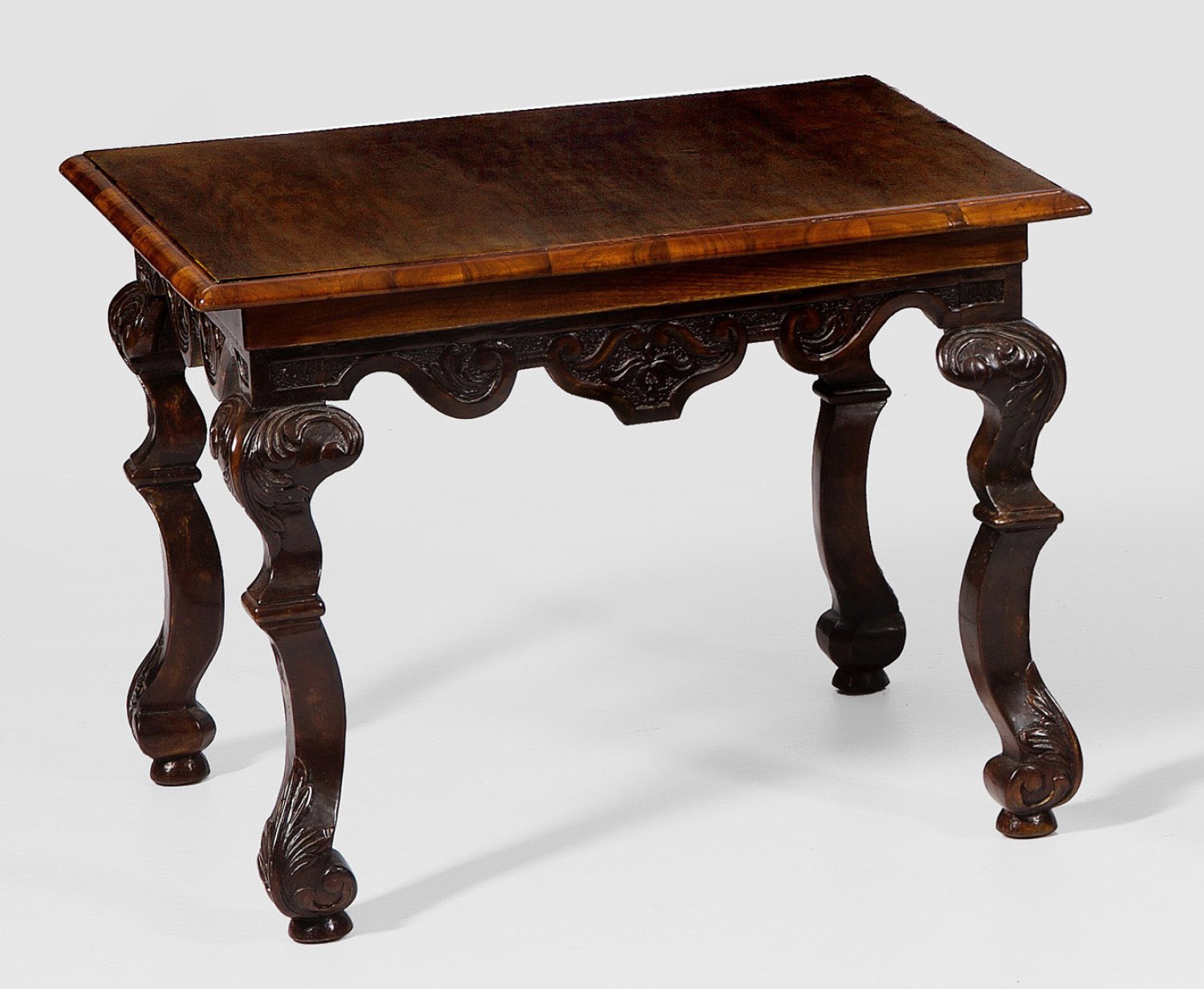 Nussbaum, teilw, reliefplastisch geschnitzt. Passig geschweifte Zarge mit Volutenmotiven auf stark geschwungenen, gekanteten und blattreliefierten Beinen als Träger für erg. profilierte Deckplatte. H. 46 cm. 61 cm x 51 cm.
