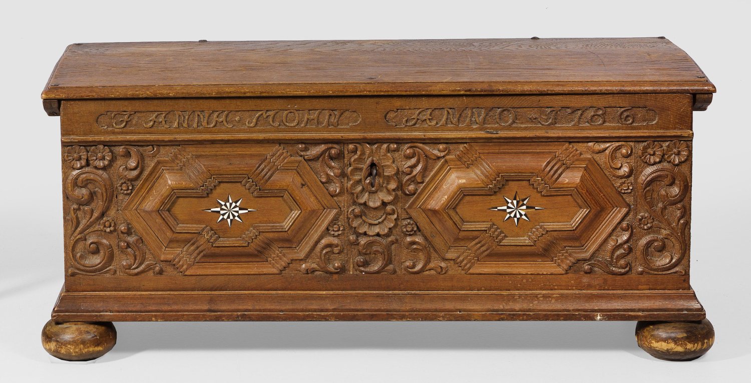 Eichenholz, teilw. geschnitzt. Gerader, querrechteckig angelegter Korpus auf profilierter Zarge und schauseitig, gedrückten Füßen. In der gegliederten Front zwei große Bastionfüllungen mit Faltsternen aus Knochen, umgeben von reliefierten Volutenmotiven. Oberhalb bez. F. Anna Möhn Anno 1786. Gering überstehender Flachdeckel. Innen sog. Hohe Kante. H. 54 cm. 127 cm x 52 cm.