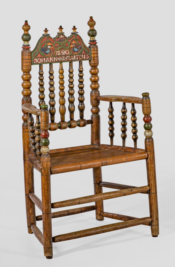 Buchenholz, dunkel gebeizt und teilw. farbig bemalt. Gestell aus mehrfach gegliederten Balusterstreben mit gebogten Armlehnen sowie hoch aufgeworfenem Lehnenabschluss. Sitzfläche aus Binsengeflecht. Sitz-H. 47 cm.
