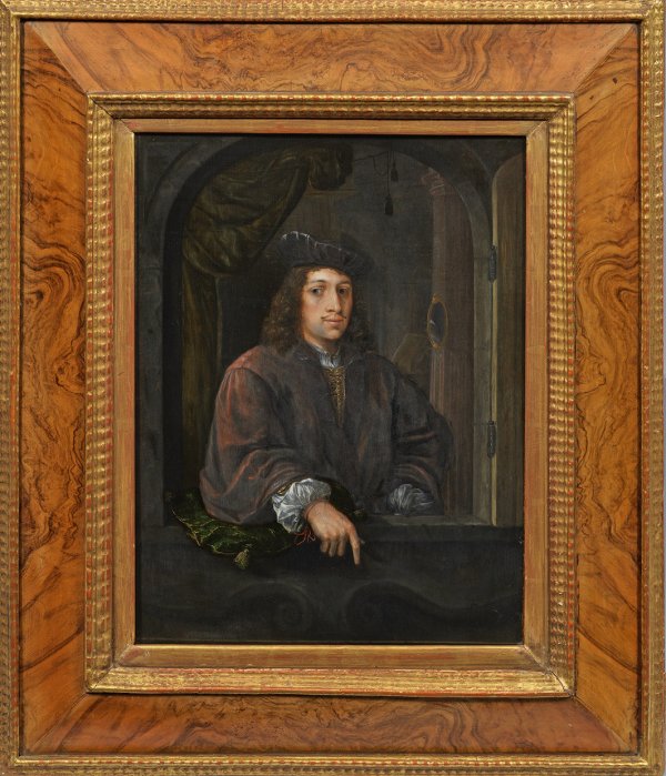 In ein steinernes Fenster komponiertes, genrehaftes Bildnis Eduard van Voorsts im Alter von 35 Jahren, dargestellt als Ratsherr in brauner Robe und Barett, seinen rechten Arm auf ein grünes Samtkissen gebettet. Hinter dem Porträtierten öffnet sich der Blick in ein undeutliches Interieur, das von einem schweren Vorhang in der linken Bildhälfte begrenzt wird. Das feinmalerische, harmonisch angelegte Tafelbild steht ganz in der Tradition der sog. "Fensterbilder", wie sie vor allem der Leidener Maler Gerrit (Gerard) Dou (1613 - 1675) prägte. Dies ist besonders an der Bildkomposition zu erkennen, die augenscheinliche Parallelen zu dem "Selbstbildnis im Fenster" Dous aufweist (Slg. der Residenzgalerie in Salzburg, Inv.-Nr. 536). Das Bildnis stellt eine seltene, der Genremalerei nahestehende Arbeit im Oeuvre Schoocks dar, der sich als Schüler von Abraham Bloemaert und Jan Davidz. de Heem fast ausschließlich der Stilllebenmalerei widmete. Bei Houbraken findet sich jedoch der Hinweis, dass sich Schoock, der auch als Schüler in der Werkstatt von Jan Lievens tätig war, zunächst als Genremaler versuchte und erst anschließend seine Spezialisierung auf die für ihn charakteristischen Blumenstücke fand. Das vorliegende Kabinettstück stellt Schoocks Cousin Eduard van Voorst (1638 - 1694) dar und ist (laut rückseitiger Datierung) in genau dem Jahr entstanden, in dem der Maler und sein Vetter eine Wette abschlossen: das Jahr 1673. Bestandteil dieser Wette war laut überlieferter Quellen, wer von den beiden Konkurrenten zuerst heiraten würde - der Ausgang dieser Abmachung ist jedoch nicht hinlänglich geklärt. 1697 gründete Schoock zusammen mit Gerard Hoet (1648 - 1733) eine Zeichenakademie in Utrecht. Öl/Eichenholztafel. L. u. sign.; Verso altes Papieretikett mit Hinweisen zum Dargestellten und Jahresangabe 1673. 49 cm x 37 cm. Rahmen.