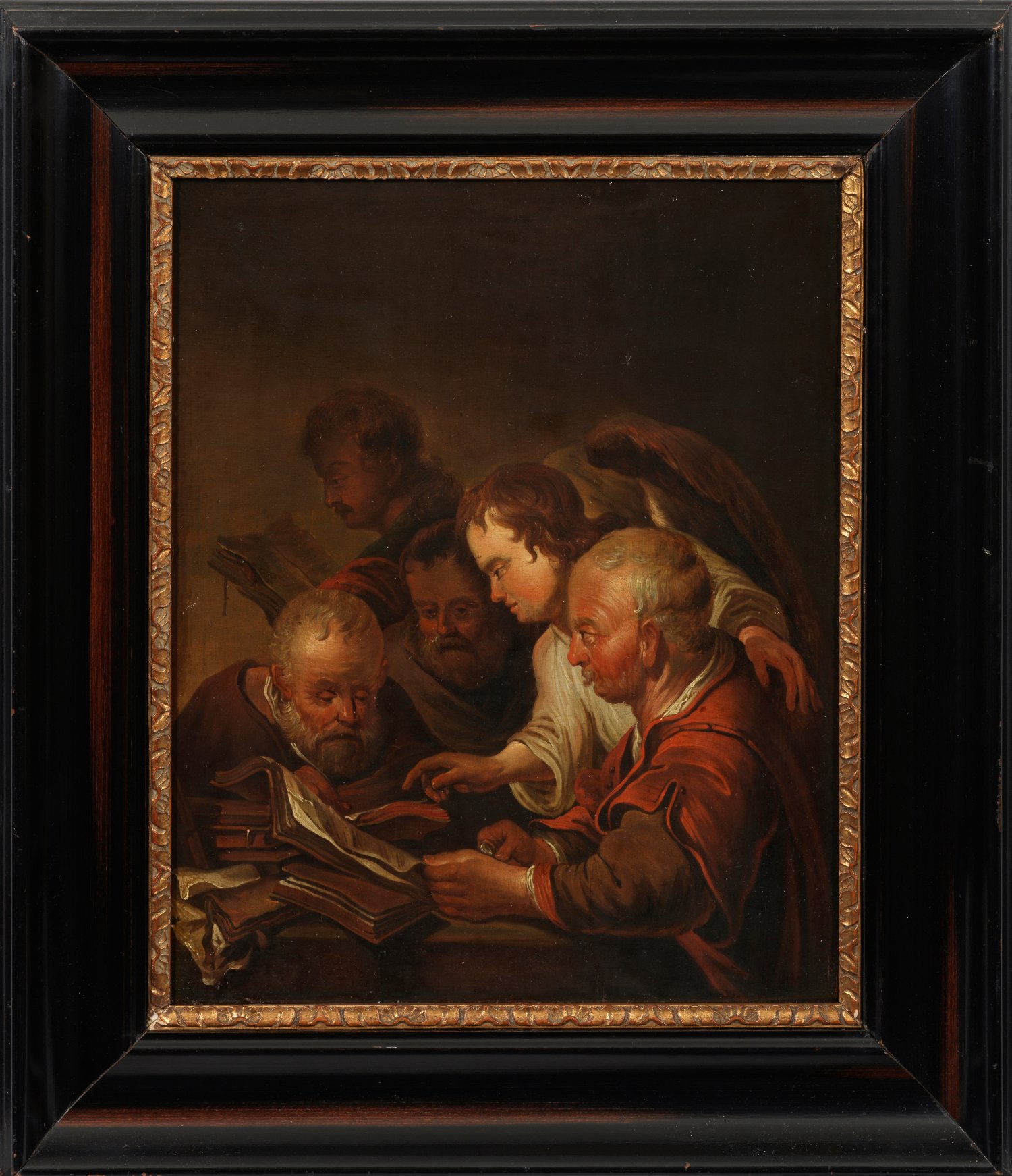 In einer Vermischung aus religiösem Historienbild und Genreszene in der fürs Zeitalter Rembrandts und die Amsterdamer Schule typischen Helldunkel-Malerei, sind die vier Evangelisten ins Bücherstudium vertieft, während ihnen ein ins helle Licht gesetzter Engel Mitteilungen macht. Öl/Eichentafel. Verso zwei rote Wachssiegel und Reste einer früheren Bildbeschreibung aus einem Katalog. 41 cm x 33,5 cm. Rahmen.//