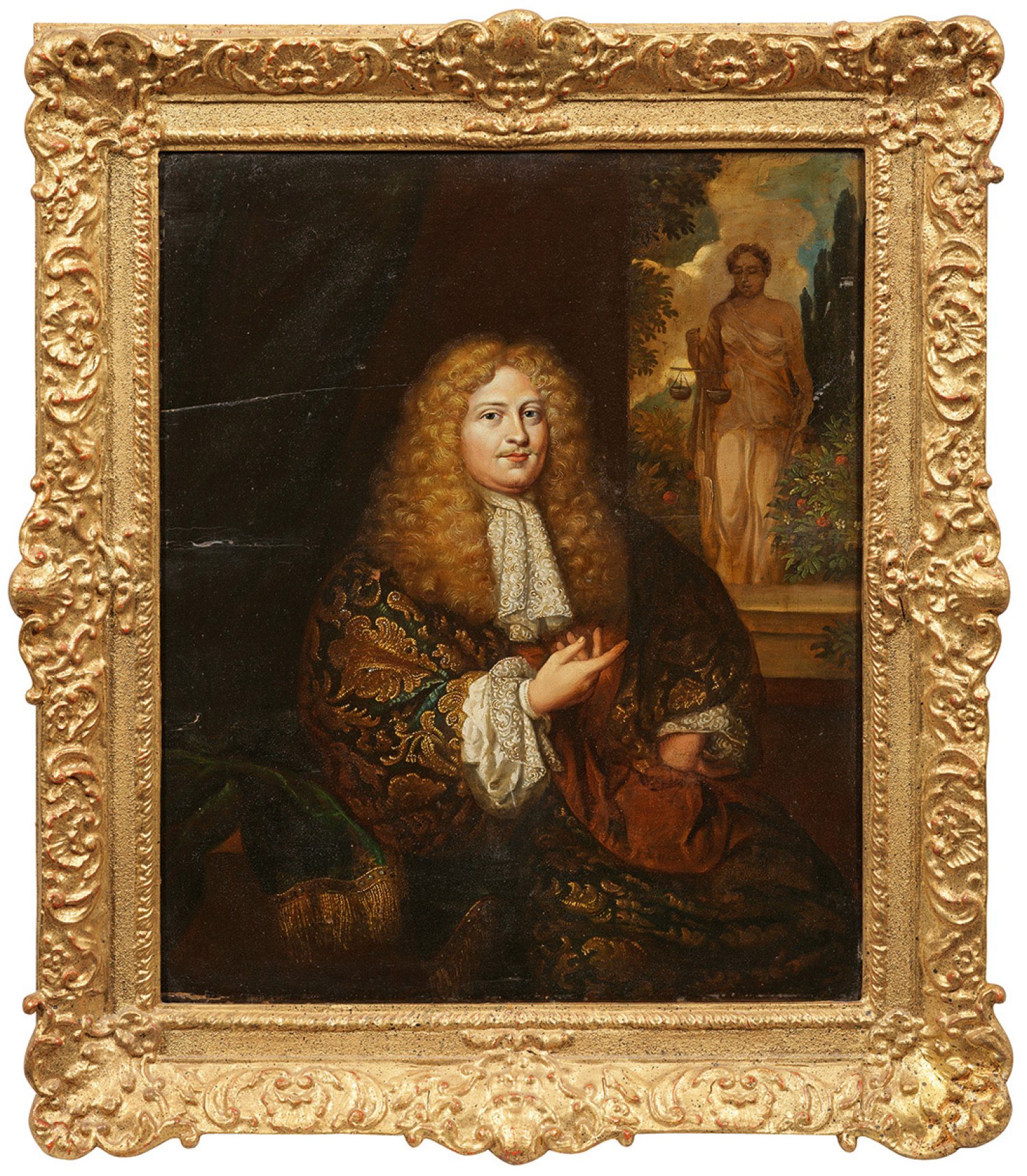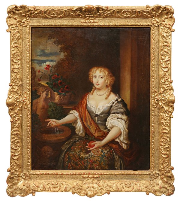 Gegenstücke. Feinmalerisch ausgeführte Darstellungen nach dem bekannten Gemäldepaar Netschers von 1679/80 in der Gemäldegalerie der Staatlichen Museen zu Berlin (Inv.-Nr. 850B und 850ßC), das sich zuvor bis 1893 in Berliner Privatbesitz befand. Die beiden Porträtierten sind ganz offensichtlich Angehörige einer sehr wohlhabenden Schicht von hohem Status, es dürfte sich mit Sicherheit um hochstehende Persönlichkeiten mit engeren Bezügen zum Haager Hof handeln. Auf beiden Bildnissen ist das Motiv der Orange zu sehen, augenfällige Hinweise auf die regierende Statthalterfamilie der Oranier in den Niederlanden. Der stattliche Herr wird in selbstbewusster, das Bild dominierende Pose dargestellt, die im Hintergrund platzierte Justitia-Statue ist wohl ein Hinweis auf seine Stellung als Richter oder Magistrat. Im Gegensatz hierzu ist die porträtierte Dame, graziler und zierlicher geschildert, ihr üppiger Perlenschmuck symbolisiert nicht nur Reichtum, sondern kann sich auf auch andere Eigenschaften wie Reinheit, Liebe, Keuschheit und Schönheit beziehen. Öl/Holztafel. 60 cm x 50 cm. Rahmen.