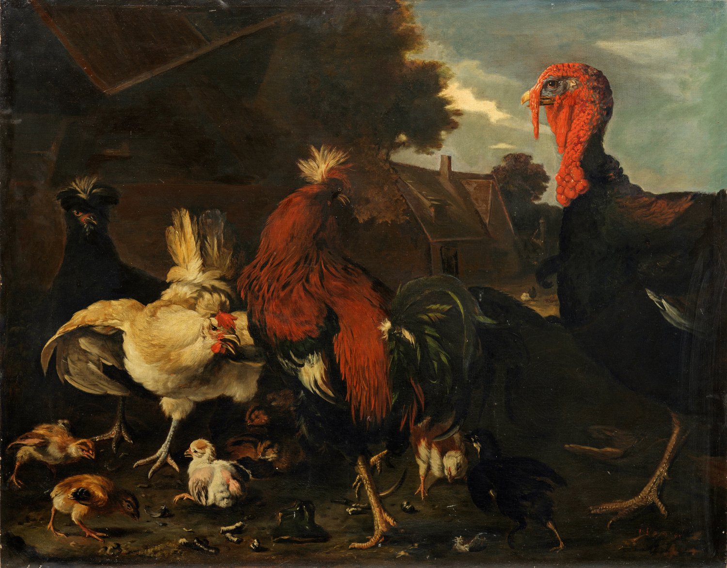 In altmeisterlicher Malerei ausgeführte, lebendige Darstellung eines Truthahns im Profil, eines stolzen Hahns, gackernder Hennen und flauschiger Küken vor einem Bauernhof. Der auf Geflügeldarstellungen spezialisierte Barockmaler beeinflusste über Jahrhunderte zahlreiche Künstler mit diesem Motivrepertoire. Öl/Lwd.; 95,5 cm x 112 cm.