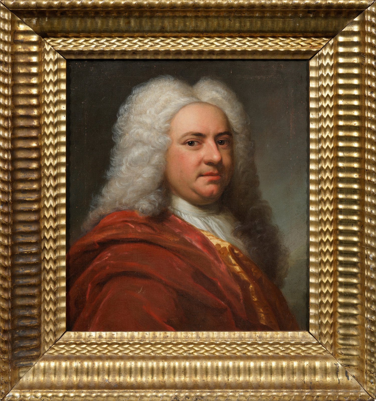 Mit effektvoller Lichtführung inszeniertes, repräsentatives Brustbild des bedeutenden Barockkomponisten mit üppiger Perücke und wallendem, rotem Umhang. Subtil charakterisiertes, mit weichem, äußerst lebendigem Farbenschmelz gemaltes Bildnis in der Tradition des bedeutenden Porträtisten Balthasar Denner, der bei Hofe als einer der gefragtesten Bildnismaler seiner Zeit galt und auch Georg Friedrich Händel nachweislich porträtierte, wie u. a. ein Balthasar Denner zugeschriebenes Bildnis in der National Portrait Gallery in London belegt (Inv.-Nr. NPG 1976). Öl/Lwd., doubliert. 41 cm x 33,5 cm. Rahmen.