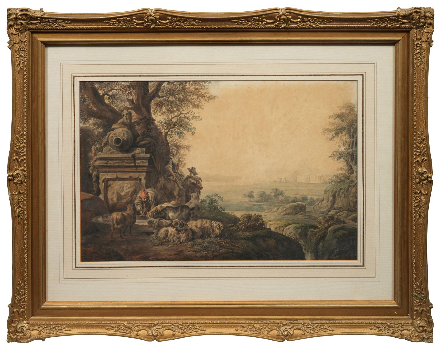 An einem Steinbrunnen unter einem Schatten spendenden Baum versorgt ein Hirte seine Schafsherde, während ein Wandererpaar dahinter ebenfalls eine Rast eingelegt hat und in ein Gespräch vertieft scheint. Hinter der Szene, die auf einem Felsplateau spielt, öffnet sich eine weite, flache Landschaft. Charakteristische, subtil ausgeführte Arbeit Troostwijks, der Schüler bei Anthonie und Juriaan Andriessen war, an der Amsterdamer Akademie studierte und sich von Paulus Potter und Jacob van Ruisdael inspirieren ließ. Tusche und Aquarell/Papier. L. monogr. und dat. 1807. 33 cm x 49,8 cm (Passepartoutausschnitt). Rahmen.