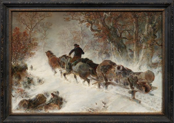 Das wohl um 1860 entstandene Gemälde ist in künstlerischer Qualität, Motiv und Stil repräsentativ für Kauffmanns Oeuvre. Geschildert wird ein von zwei Pferden gezogenes, schwer mit einem Baumstamm beladenes Fuhrwerk bei Schneegestöber durch einen norddeutschen Eichenwald, aus dem zwei Holzfäller hinzutreten. Die Schwerstarbeit des Ziehens erhält in Gestalt der unwirklichen Natur und des Schneetreibens eine dramatische Steigerung. Zu Kauffmanns Haupsujets zählten ab 1848/50 realistische Winterlandschaften mit Fuhrwerken, die sich durch ihre subtile, genau beobachtete Wiedergabe sowohl der Szenen als auch der Landschaft, der Natur und Schneestimmung auszeichnen. Aus dieser Werkreihe stammt auch das bekannte Gemälde "Holzfuhre im Schnee" von 1858 in der Hamburger Kunsthalle. Öl/Lwd.; L. u. sign.; 47 cm x 66,5 cm. Rahmen.
