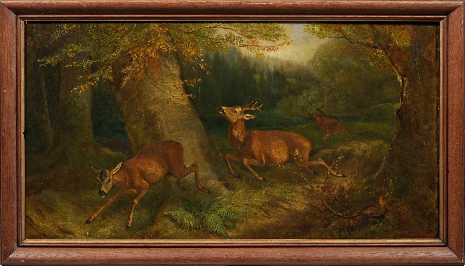 Großes hochdynamisches Werk des Tier- und Jagdmalers mit zwei offenbar vor einem Jäger fliehenden Rehen, ein drittes liegt im Hintergrund erlegt, während der Jäger selbst im Bild nicht zu sehen ist. Benno Adam war der Sohn und Schüler des Münchner Pferdemalers Albrecht Adam. Seine Hauptsujets bildeten neben der Darstellung von Haus- und Jagdtieren, Hoch- und Fuchsjagdszenen mit Reitern und Hundemeuten, nicht zuletzt Darstellungen einzelner Hunde und Hundegruppen. Öl/Lwd., doubliert. R. u. sign. u. dat 1884. Rahmen.