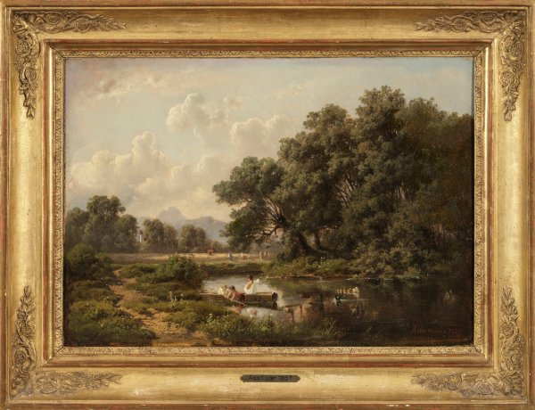 Ländliche Szene vor den Toren Münchens mit spielenden Kindern an einem Tümpel, im Hintergrund Bauern bei der Getreideernte. Mit lockerem Duktus gemalte Sommerlandschaft des ab 1849 in München ansässigen Malers, der sich von der Plein-Air-Malerei kommend zu einem der herausragenden Vertreter der Münchner Landschaftsschule der zweiten Hälfte des 19. Jhs. entfaltete. Öl/Lwd., doubliert. R. u. sign., ortsbez. "München" und dat. 1857. Verso altes Ausstellungsetikett. 33 cm x 46,5 cm. Rahmen.