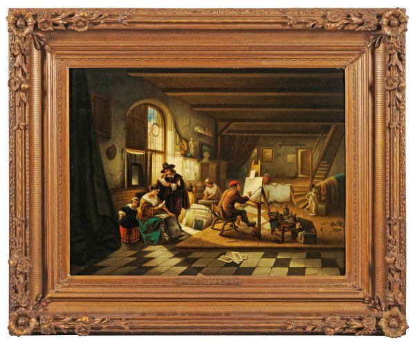 Blick in das großzügige Atelier eines Malers in den Niederlanden des 17. Jhs.; Der Raum mit Maler an der Staffelei, Besuchern und einem Helfer in historischen Gewändern ist mit einer Fülle von still lebenhaft arrangierten Gegenständen und Malutensilien auf Fußboden und an Wänden ausstaffiert. In die Dunkelheit gelangt nur durch ein seitliches Fenster Licht, wodurch sich der besondere Reiz der differenzierten Hell-Dunkel-Modulation in der künstlerischen Ausführung ergibt. Toutenel gehört in den Kreis der sogenannten Neuen belgischen Historienmalerei, welche zur Mitte des 19. Jhs. und ausgehend von Louis Gallait und Edouard de Biève in ganz Europa Furore machte. Öl/Eichenholztafel. L. u. sign.; 51 cm x 66 cm. Rahmen.