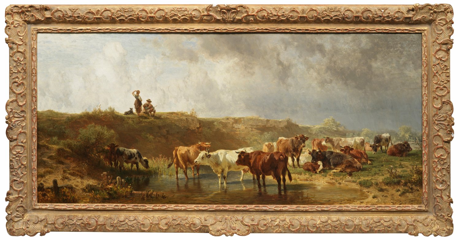 Auf einer Anhöhe, unter hohem Himmel mit von rechts aufziehenden Gewitterwolken, wartet ein Hirtenpaar mit Hund. Eine Herde bunt gefleckter Rinder hat sich an einer Wassertränke versammelt, einige Kühe schreiten durchs Wasser während andere mit ihren jungen Kälbern am Ufer ruhen. Stimmungsvolle Wiedergabe mit gekonnter, einfühlsamer Schilderung des idyllischen Naturschauspiels. Nach seinem Studium an der Münchener Akademie (1834/35) wurde das Jahr 1841 zum Wendepunkt für Voltz, als er in Holland erstmals das Bild "Der junge Stier" von Paulus Potter sah und er sich danach vorrangig der Tiermalerei widmete. Seine Landschaften mit Tieren malte er, wie im vorliegenden Bild, gern auf überbreite Bildformate. Ab etwa 1850 beschäftigte Voltz sich mit der lebensnahen Darstellung der Tiere und der ländlichen Bevölkerung seiner bayerischen Heimat. Beeinflusst wurde er außer durch Potter, Christian Morgenstern und Albrecht Adam insbesondere durch seine Münchener Künstlerfreunde Carl Spitzweg und Eduard Schleich d. Ä., in dessen Landschaften er bisweilen auch Kühe hineinmalte. Öl/Holz; L. u. sign.; 60,5 cm x 134 cm. Rahmen.