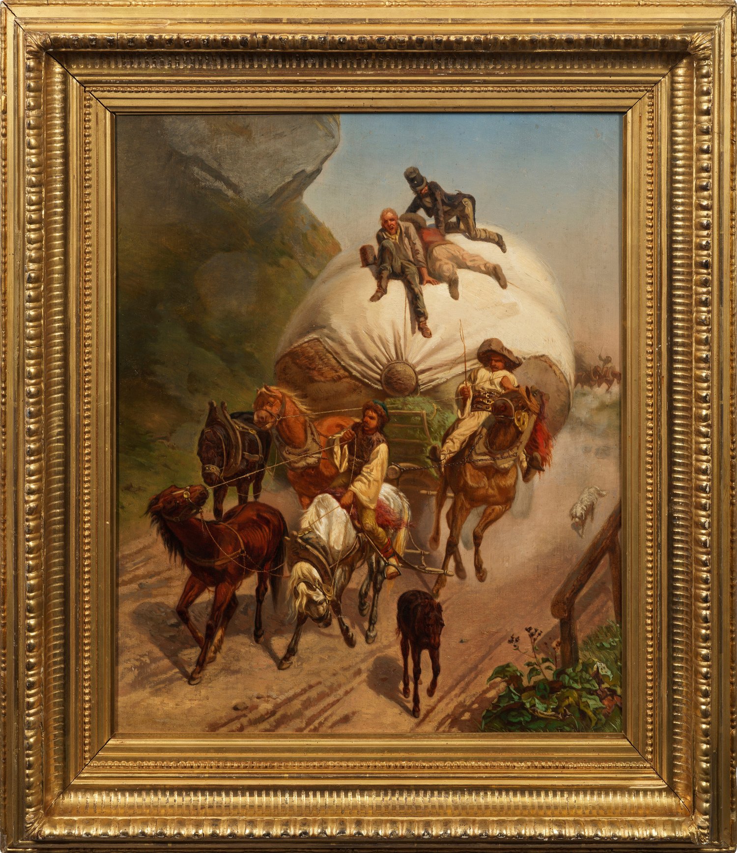 Motiv -und stiltypisches Bildnis des tschechisch-österreichischen Malers und Autors. Ein, wohl in den Karpaten befindliches ungarisches oder siebenbürgisches Pferdefuhrwerk wird überfallen und durch das Zügeln der Pferde zum Stehen gebracht. Zwerina studierte an der Prager Akademie u.a. bei Ch. Ruben und bereiste, schon während seiner Studienzeit zahlreiche Länder rund um das Gebiet der Karpaten bis nach Kroatien, Bosnien Herzegowina Montenegro, Mazedonien, Albanien, Bulgarien, Russland und Ägypten. 1876 ging er nach Wien und Zwettl. Er war Mitglied u.a. der Akademie der Wissenschaften in Prag und Wien und der Wiener Künstlergenossenschaft. Links unten signiert. Öl/Lwd. 62 cm x 50,5 cm.