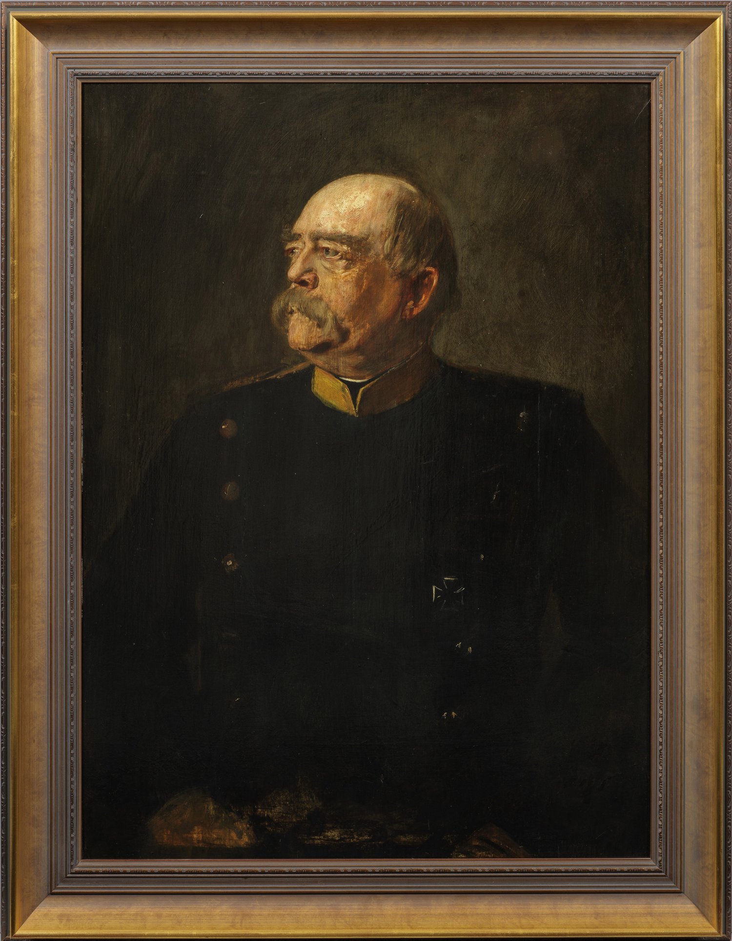 Mit virtuos flüssigem Duktus schildert Lenbach den nach rechts blickenden Staatsmann Otto Fürst von Bismarck in der Halberstädter Kürassieruniform mit gelbem Kragen und schwarzem Interimsrock. Die effektvolle, meisterlich inszenierte Lichtführung lässt den ohnehin neutral gehaltenen, graubraunen Hintergrund und die Kleidung des Porträtierten im Dunklen verborgen und setzt einen klaren Fokus auf die signifikanten Gesichtszüge, in denen die durchaus nachdenkliche Persönlichkeit Bismarcks ausdrucksvoll charakterisiert wird. Ein in Pose, Mimik, Uniform und dargestelltem Alter Bismarcks vergleichbares Porträt befindet sich im Pushkinmuseum in Moskau (Inv.-Nr. J-4402), hier mit heruntergeschlagenem Revers. Ausgebildet an der Münchner Akademie vor allem als Schüler von Karl Theodor von Piloty, avancierte Lenbach ab 1868 zu einem der bedeutendsten und gefragtesten Porträtisten des Adels, Großbürgertums und von Persönlichkeiten aus Politik, Gesellschaft, Wissenschaft und Kultur. Er porträtierte den Prinzregenten Luitpold sowie die deutschen Kaiser Wilhelm I. und II., doch vor allem seine über 80 zwischen 1874 und 1897 geschaffenen Bildnisse des Reichskanzlers Otto Fürst von Bismarck prägen bis in die heutige Zeit das öffentliche Bild des Dargestellten und dessen Nachruhm und rechtfertigen nicht zuletzt den Ruf Lenbachs als herausragenden Malerfürsten der Jahrhundertwende und die damit verbundene gesellschaftliche Stellung. Öl/Holztafel (parkettiert). L. u. sign.; Verso auf Inventaretikett des Reichsministeriums für Volksaufklärung und Propaganda bez. und betitelt sowie mit Inv.-Nr. 100/1937 (Verzeichniss der Ankäufe), darüber der handschriftliche Vermerk in Grün "100/1937 Arbeitszimmer". 71,5 cm x 96 cm. Rahmen.