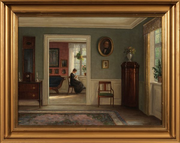 Hilsoe malte fast auschließlich Innenräume mit Biedermeier-Einrichtung, die er mit zarter Lichtregie in betont stiller, fast entrückter Atmosphäre höchst akribisch und detailgenau ausführte. In sich gekehrte, vom Betrachter abgewendete Einzelfiguren in häuslicher Beschäftigung bilden darin die einzige Staffage. Der Künstler fand die Motive für seine Raumbilder vornehmlich im Bakkehuset, einem historischen Haus bei Kopenhagen, das mit zahlreichen original erhaltenen Biedermeierräumen seit 1925 Museum ist. Seine unverwechselbaren Bilder sind bis heute sehr populär. Öl/Lwd.; R. u. sign.; 53 cm x 68 cm. Rahmen.