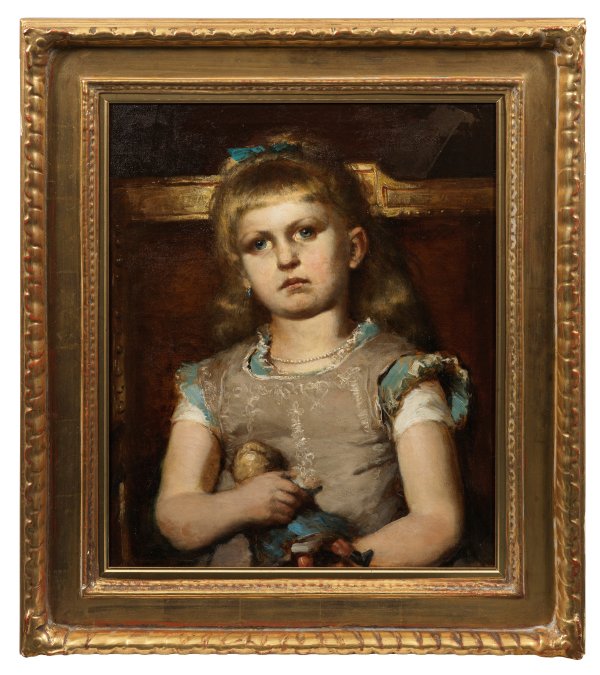 Einfühlsam charakterisiertes Brustbild eines Mädchens mit langen blonden Haaren, das eine ebenfalls blonde Puppe in den Händen hält und ihren Blick in die Ferne wendet. 1879 gemaltes und somit frühes, in der Studienzeit entstandenes Werk Zatzkas, der 1877-1882 die Akademie in Wien bei Christian Griepenkerl, Carl Wurzinger und Carl von Blaas besuchte und 1880 mit der Goldenen Füger-Medaille ausgezeichnet wurde. Nach Studienaufenthalten in Italien kehrte der Künstler nach Wien zurück. Zu seinen Lieblingsmotiven zählten Elfen, Amoretten, sinnliche Frauengestalten, Genreszenen, Allegorien und andere populäre Darstellungen, die vielfach auch als Bildpostkarten, Kunst- und Öldrucke weite Verbreitung fanden. Öl/Lwd.; Verso sign. und dat. 1879. 53 cm x 42,3 cm. Rahmen.