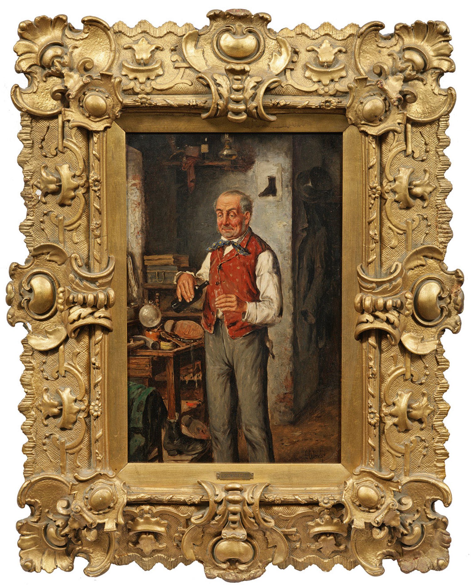 Humorvolle Darstellung eines alten Schusters in seiner Werkstatt, der sich nach getaner Arbeit einen verdienten Tropfen gönnt. Der Genremaler schilderte mit Vorliebe heimelige Interieurszenen mit sympathisch charakterisierten Figuren, neben geselligen Gruppen und Jüdischgläubigen bzw. Rabbinern oft traditionell arbeitende Handwerker bei ihren typischen Tätigkeiten. Öl/Holztafel. R. u. sign. u. undeutl. dat. "(19)04(?)". Verso bez. u. betitelt "No. 9654 Kunstpause". 47,5 cm x 31 cm. Wohl Original-Rahmen.