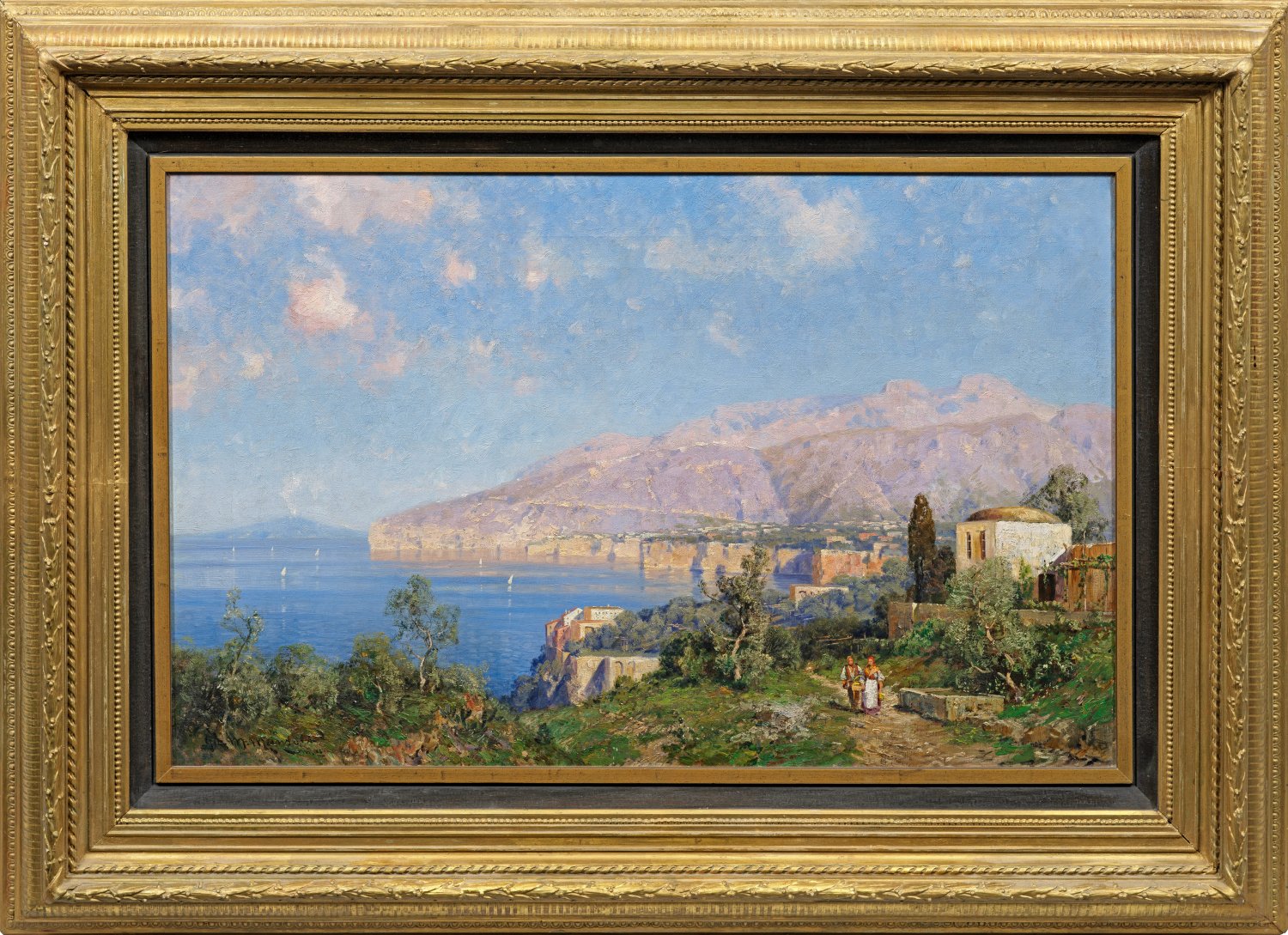 Mediterrane Stimmungslandschaft in impressionistischer Hellmalerei. Meinzolt studierte an der Kunstschule in Weimar, wo er die Plein-Air-Malerei als Grundlage der Landschaftsmalerei kennenlernte. Öl/Lwd.; L. u. sign. mit Ortsbezeichnung M(ünchen) u. dat. (19)06. Verso von der Hand des Künstlers betitelt. 51,5 cm x 80,5 cm. Rahmen.