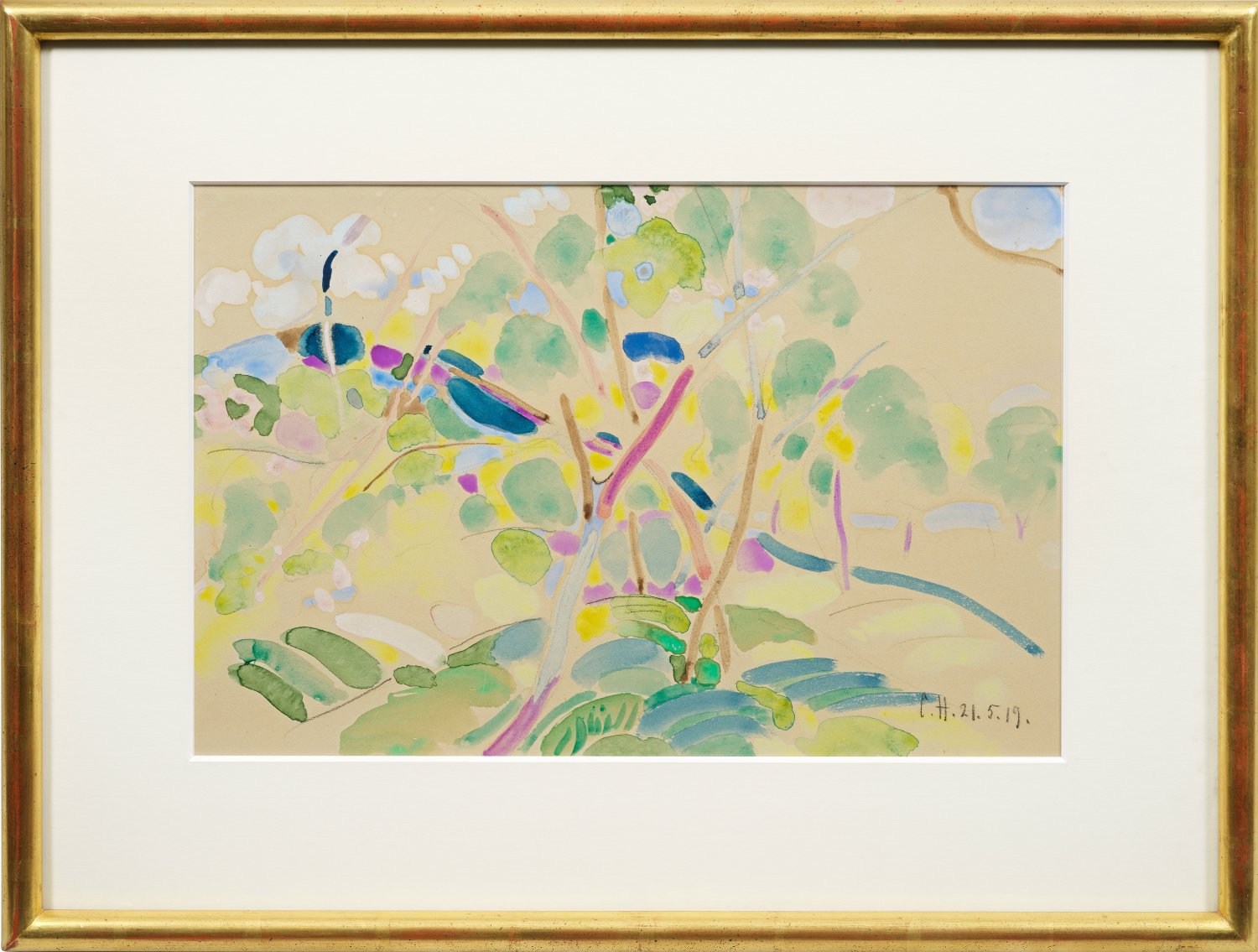 1897 heiratete Herrmann seine 18 Jahre jüngere Malschülerin Sophie Herz, Tochter eines jüdischen Kaufmanns in Nürnberg, der 1852 Schloss Pretzfeld in Oberfranken gekauft hatte. Dort ließ sich das Paar von dem Architekten und Designer Henry van de Velde eine komplette Wohnung quasi als Gesamtkunstwerk einrichten. 1918 wurde Herrmann zum Professor der Berliner Akademie ernannt, während seines Aufenthaltes auf Schloss Pretzfeld im Frühjahr des selben Jahres, entstanden mehrere aquarellierte Pastellkreidezeichnungen mit Weißhöhungen in expressiv-reduziertem Duktus. Die schattenlosen, seltsam gebogenen und sich kreuzenden Obstbäume mit Höhenunterschieden lösen sich noch stärker von der Gegenständlichkeit ab als seine vorherigen Motive. Herrmann gilt als einer der führenden deutschen Vertreter des Neoimpressionismus, der sich bis ins hohe Alter künstlerisch immer weiterentwickelte. Aquarell und Deckweiß/Papier. R. u. monogrammiert und tagesdatiert 21.5(19)18. Passepartoutausschnitt 31 cm x 46,5 cm. Rahmen.