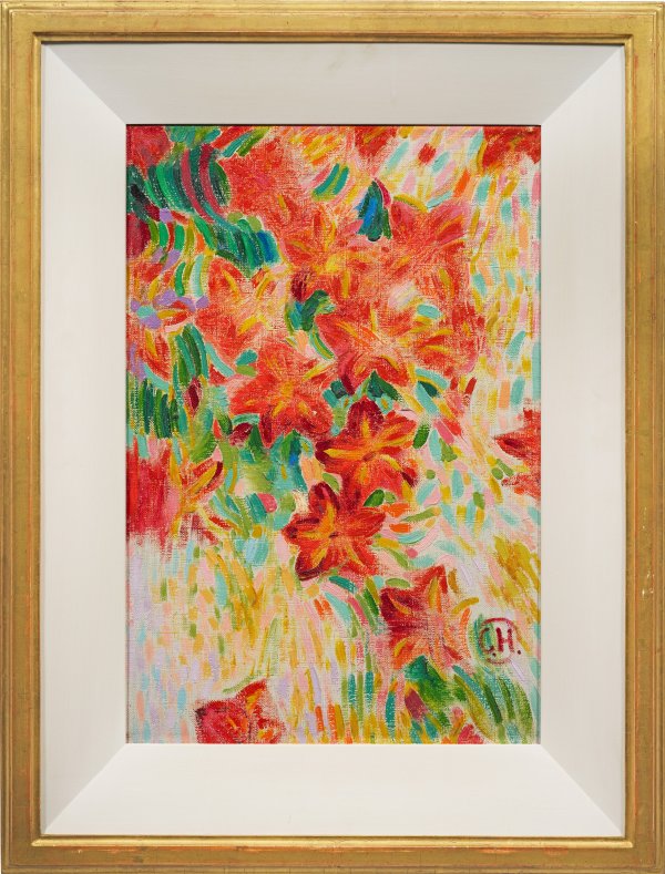 Der Blick geht seitlich auf ein buschiges Blumenbeet mit verstreuten, rot-orange-gelben Blüten, dazwischen im neoimpressionistischen Malduktus der Stricheltechnik rosa, violette und hellblaue Farbkommata, die nach oben hin ins Dunkelgrün changieren. Der Künstler kommt hier der Auflösung des Gegenständlichen in den frühen 1920er Jahren erstaunlich nahe, entschließt sich aber doch die Blüten als nicht gefüllte Chrysanthemen morphologisch identifizierbar darzustellen. Landschaften und Blumenbilder in neoimpressionistischer Farb- und Formsetzung zählen zu seinen bevorzugten Bildmotiven nach 1910. Zuvor hatte Herrmann 1897 seine 18 Jahre jüngere Malschülerin Sophie Herz geheiratet, Tochter eines jüdischen Kaufmanns in Nürnberg, der 1852 Schloss Pretzfeld in Oberfranken gekauft hatte. Dort ließ sich das Paar von dem Architekten und Designer Henry van de Velde eine komplette Wohnung quasi als Gesamtkunstwerk einrichten. 1918 wurde Herrmann zum Professor der Berliner Akademie ernannt. Das um 1920 entstandene Gemälde der Chrysanthemen dürfte im Garten von Schloss Pretzfeld entstanden sein. Herrmann gilt als einer der führenden deutschen Vertreter des Neoimpressionismus, der sich bis ins hohe Alter künstlerisch immer weiterentwickelte. 1898 war Herrmann Gründungsmitgliedern der Berliner Sezession und nach der Teilung der Künstlergruppe, 1914, wurde er Präsident der Freien Sezession. Seit 1902 engagierte Herrmann sich zudem im Deutschen Künstlerbund. Öl/Lwd. R. u. monogrammiert im Kreis, Bildtitel auf dem Rahmen wohl vom Künstler vermerkt. 47,5 cm x 32 cm. Rahmen.