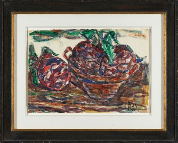 Mit furiosem, expressionistischem Duktus ausgeführtes Stillleben mit Kohlrabi und Schale, bei dem das Gegenständliche gegenüber dem Rhythmus der Strichlagen zurücktritt. Der Individualist Christian Rohlfs gehört zu den großen, bedeutenden deutschen Malern der Moderne. Vom Ersten Weltkrieg zutiefst erschüttert, war für Rohlfs der Zeitraum von ca. 1915 bis 1927 in seinem Schaffen eine Phase der Reife und Verinnerlichung. Er wandte sich von der Ölmalerei ab und der Aquarell- und Temperatechnik zu, wobei er nun dunklere, verhaltene Töne bevorzugte. In dieser Periode rückten Landschaften, Stadtansichten, Architektur und Stillleben in den Mittelpunkt seines Schaffens. Sie sind Ausdruck seiner persönlichen Annäherung an die Natur und leiten damit sein Spätwerk ein. Eine besondere Stellung in seinem facettenreichen Oeuvre nehmen in diesem Kontext die Aquarelle und Wassertemperaarbeiten und damit die zahlreichen Blumenbilder, Landschaftsansichten sowie Stillleben von außergewöhnlicher Farbwirkung ein, bei denen man eine "Entmaterialisierung des Dinglichen" (Zit. Paul Vogt) beobachten kann. Wassertempera u. Tusche/Bütten. R. u. monogr. u. dat. "CR (19)23". Ca. 35,5 cm x 51,5 cm. Rahmen.