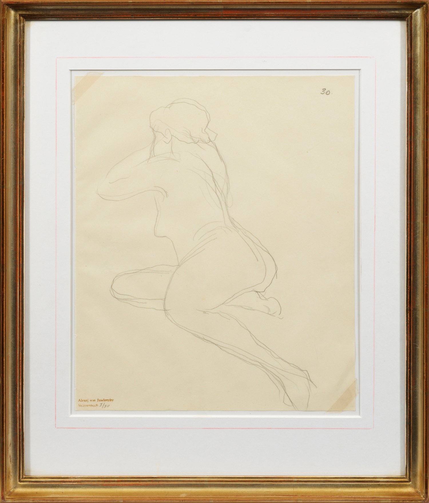 Die weich geschwungene, einfühlsame Zeichnung eines Frauenkörpers entstand während Jawlenskys früher Münchner Periode, in der er sich 1908 mit Gleichgesinnten wie Werefkin, Kandinsky und Münter zur Neuen Künstlervereinigung München (N.K.V.M.) zusammengeschlossen hatte. Sie stammt aus einem Skizzenbuch mit einstmals 56 ähnlichen Aktzeichnungen, welche die Galerie Rosenbach in Hannover 1985 ausgestellt hat. Detlev Rosenbach nummerierte die Blätter oben rechts und gab eine Echtheitsbestätigung mit seiner Unterschrift bei, die sich auch auf der Rückseite dieses Blattes befindet. Bleistift/Papier. Recto mit dem Stempel "Alexej von Jawlensky Skizzenbuch" und der eingetragenen Nummer I/30; Verso im Sichtfenster kleiner fixierter Zettel mit der Bestätigung durch Rosenbach. 30,5 cm x 23,6 cm. Rahmen.