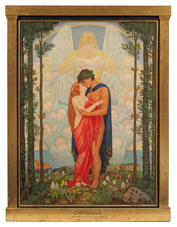 Spätwerk des Symbolismus, inspiriert von der romantisch-lyrischen Kunst Moritz von Schwinds und den englischen Präraffaeliten. In einer Paradieslandschaft stehen ein junger Mann und eine Frau in antikisierender leichter Bekleidung in zarter Annäherung. Hinter ihnen erhebt sich als traumhafte Erscheinung aus einer anderen Welt in blassen Farben gemalt eine Mutter mit Engelsflügeln und einem Säugling im Arm. Sie wird von einer Schar barocker Putten umschwärmt. Auf dem Originalrahmen findet sich neben dem Bildtitel "Empfängnis" ein Zitat aus Goethes Faust II "Am farbigen Abglanz haben wir das Leben", welches für die symbolisch-allegorische Ausdeutung des Bildinhalts breiten Raum schafft. Kämmerer studierte an der Kunstschule in Stuttgart. Ab 1900 war er längere Zeit in Tägerwilen in der Schweiz ansässig, seit den 1920er Jahren ist er in München nachweisbar. Seine weithin beachteten Gemälde zeigte er ab 1891 auf Ausstellungen im Münchener Glaspalast, dem Pariser Salon, der Großen Berliner und Internationalen Kunstausstellung in Berlin. Öl/Holz; R. u. monogr. u. dat. 1936. 154 cm x 116 cm. Rahmen.