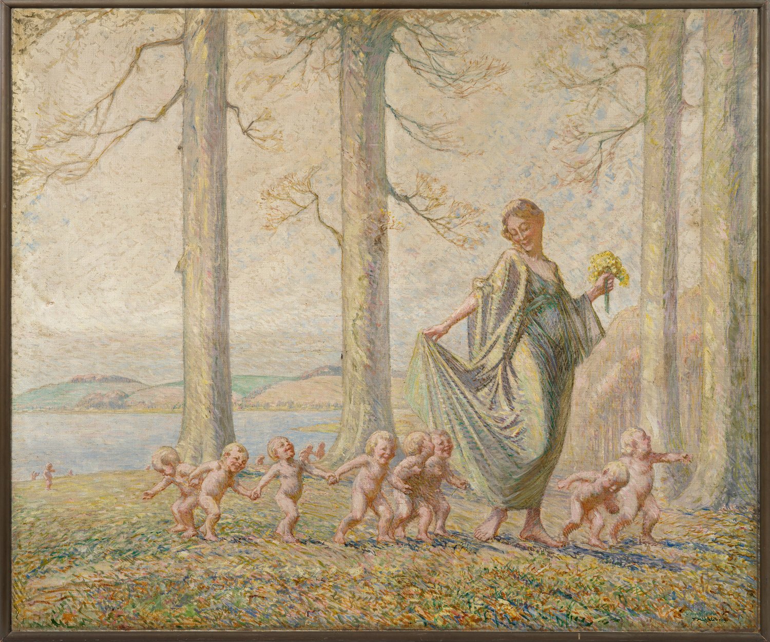 Eine zwischen Bäumen wandelnde Flora als Verkörperung des Frühlings, von einer Schar Putten begleitet. Das große, dekorativ-wandbildartige, flächige Werk vermittelt durch pastelltonige Farbgebung und Pinselduktus auf relativ grobem Rupfen als Bildträger den Eindruck eines Gobelins der Rokokozeit. Mißfeldt war zum einen Landschaftsmaler, aber auch Dekorationsmaler und Illustrator und schuf eine Reihe von Entwürfen für gewebte Wandbehänge. Seine Arbeiten finden sich in Museen in Husum, Flensburg und Kiel, das Kieler Stadtmuseum widmete ihm 2012 eine monografische Ausstellung unter dem Titel "Ein Kieler Künstler zwischen Moderne und Tradition." Öl/ Rupfen; R. u. sign. u. dat. 1919. Beschädigt. 198 cm x 240 cm. Rahmen.