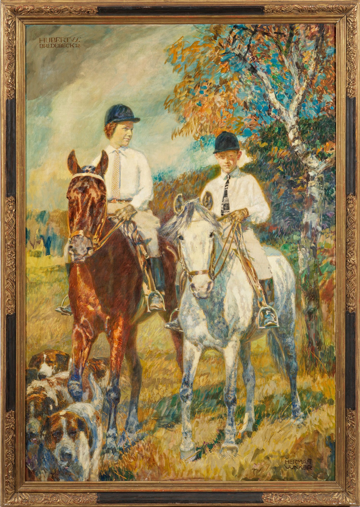 Neusachlich-realistische Porträtmalerei. Zwei reitende Kinder, das Mädchen auf einem Fuchs, der Junge auf einem Schimmel, von Jagdhunden für die Hubertus-Treibjagd begleitet. Die Bilder sind vermutlich als Auftragsarbeiten auf Schloss Bredebeck entstanden und zeigen die Kinder des damaligen Besitzers Adolf Kühling. Junker hat sich als Maler von Pferdebildern und Reiterporträts besonders aus Offizierskreisen einen Namen gemacht. Er studierte am Städelschen Kunstinstitut bei Heinrich Hasselhorst und an der Akademie in Karlsruhe bei Hermann Baisch, seit 1908 in Berlin-Charlottenburg tätig. Öl/Lwd.; R. u. sign. l. o. bez. "Hubertus Bredebeck" u. dat. (19)28. 150 cm x 105 cm. Rahmen.