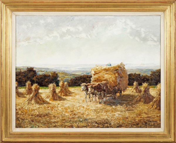 Weitgefasster Panoramablick von einer hochgelegenen Alm im Sommer während der Erntezeit. Behäbige Ochsen stehen zur Abfahrt des vollbeladenen Wagens geduldig bereit. Das mit pastosem Farbauftrag abgebildete Stroh schimmert in der Sonne fast wie Gold. Charakteristisch für seinen Malstil sind flimmernd wirkende Lichteffekte und der dicht gesetzte, pastose Farbauftrag in Spachteltechnik bzw. lockerem Pinselduktus. In Lódz geboren, bewarb sich Pippel 1896 an der Kunstgewerbeschule in Straßburg und ging später an die Kunstakademie nach Karlsruhe. Seit 1909 ist Otto Pippel dann vornehmlich in Planegg bei München ansässig. 1911 debütierte er im Münchener Glaspalast, wo er fortan seine Gemälde ausstellen ließ, die bei Sammlern guten Zuspruch fanden. Zu seinen gefragten und daher häufig gemalten Motiven zählten Ansichten von Oberbayern, Münchener Genreszenen in Biergärten und Kaffeehäusern. Das hier vorgestellte Erntemotiv erfuhr viele Darstellungsvarianten in unterschiedlichen Formaten und Anordnungen der Staffagefiguren. Öl/Lwd.; R. u. sign. 80 cm x 70 cm. Rahmen. Beigefügt ein Foto des Gemäldes als Postkarte mit rückseitigem, handschriftlichem Text des Künstlers "Umseitiges Bild 'Sommer' malte ich 1938 in Oberbayern am Chiemsee: Otto Pippel (Unterschrift), Planegg bei München/a. 16.11.39."
